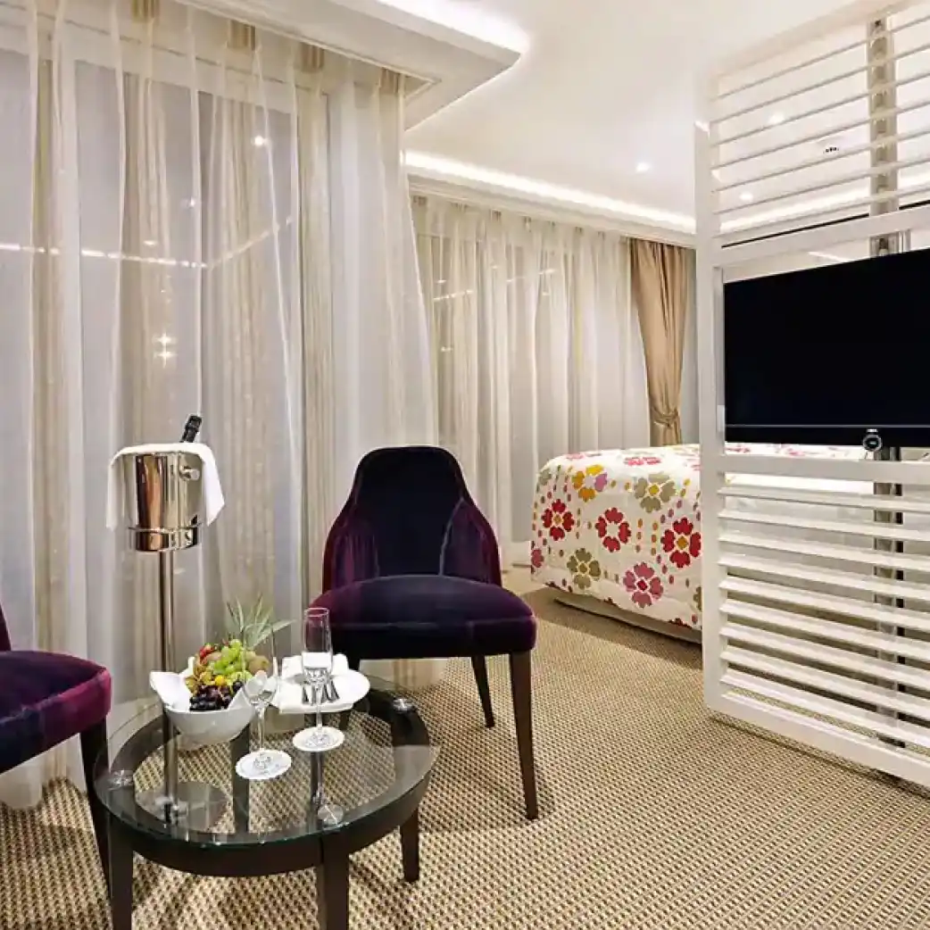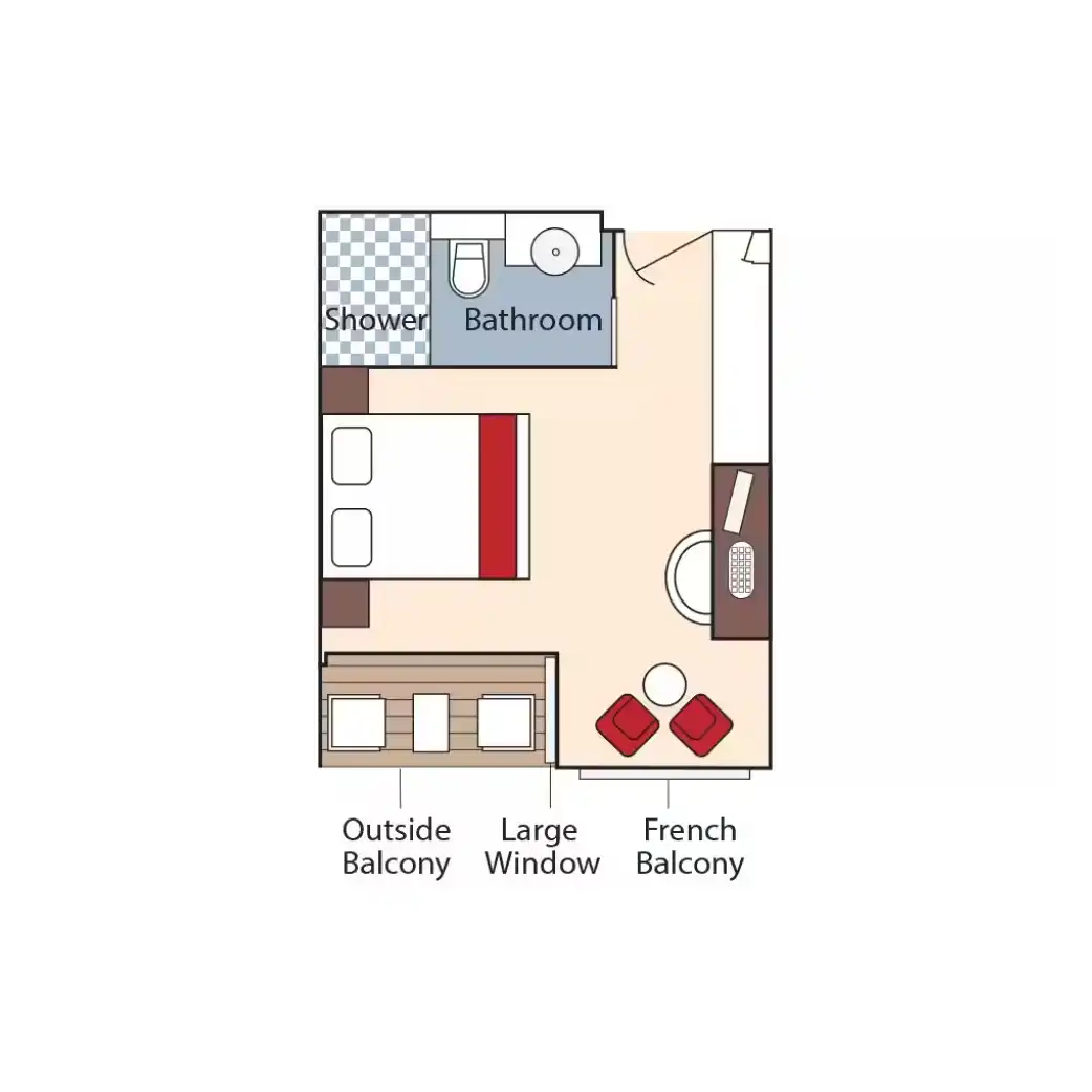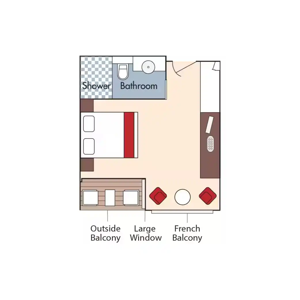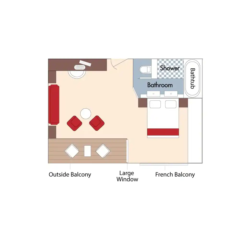 Disfrute de vistas panorámicas y mucho aire fresco en nuestras lujosas suites con balcón doble que cuentan con un balcón francés y un balcón exterior.