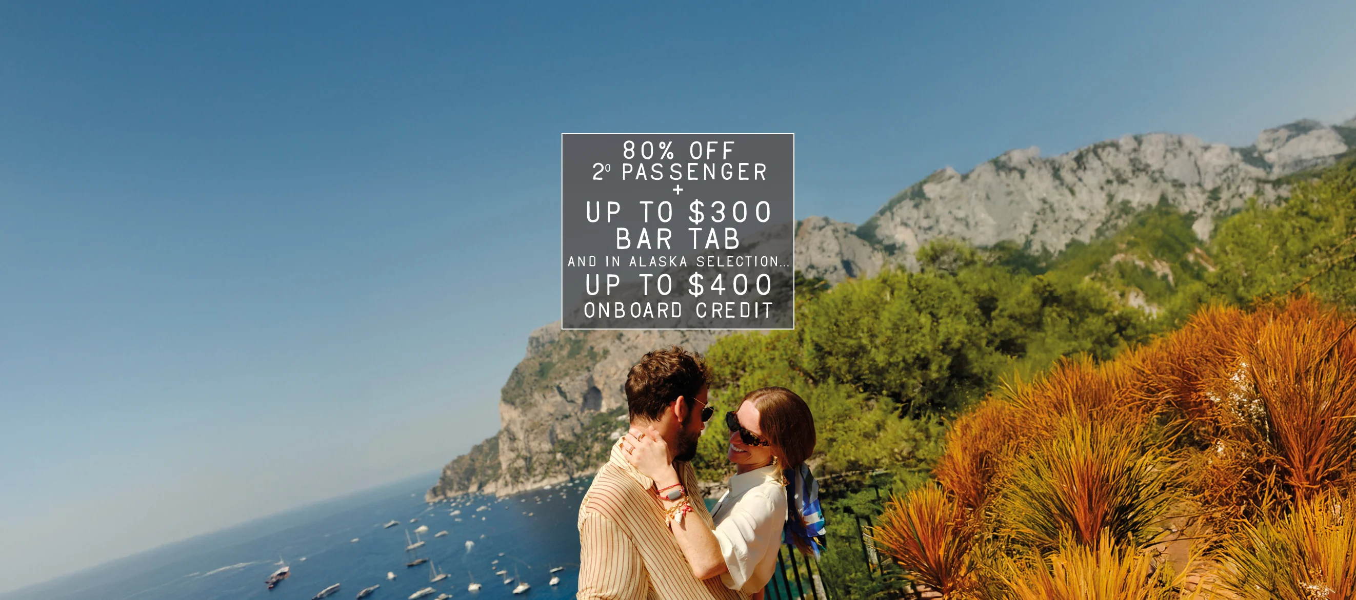 Up to 80% discount for the 2nd passenger: promotion valid for new bookings and subject to availability. Discount already applied to the price shown on the website. The discount is reflected as up to a 40% discount for the first passenger and a 40% discount for the second. Valid for Base and Essential and Lock It In fare. Applicable to all departures in Interior, Sea View and Sea Terrace categories. Not applicable to Solo Interior, Solo Sea View, Rockstars and Mega Rockstar categories.