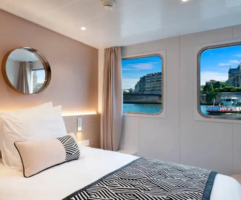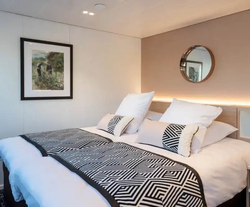 Los camarotes se distribuyen en dos cubiertas: en la cubierta superior, tienen grandes ventanales con balcón francés; en la cubierta principal, tienen amplias ventanas.