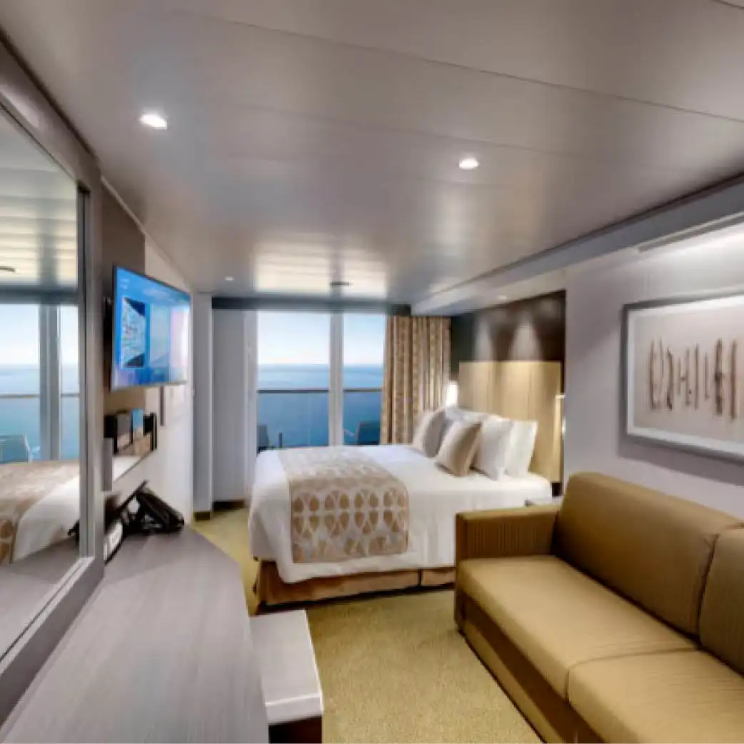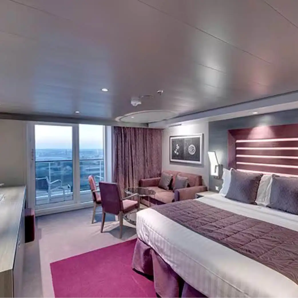 Las suites Aurea en el MSC Bellissima ofrecen un nivel elevado de confort y espacio, ideal para quienes buscan algo más que una cabina estándar sin entrar a la categoría de lujo del Yacht Club. Estas suites se ubican en diferentes cubiertas del barco, cuentan con balcón privado en muchas de ellas, y disponen de prestaciones de calidad como cama doble convertible en camas individuales bajo petición, sofá-cama o zona de descanso, minibar, TV interactiva, caja fuerte, aire acondicionado y baño privado con ducha (y en algunos casos bañera).