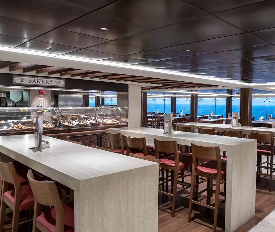 Un amplio bufé con una extensa variedad gastronómica. El bufé está abierto en el desayuno, el almuerzo y la cena, y además, también podrás picar algo por la noche. Es el lugar ideal para disfrutar de una gran experiencia gastronómica mediterránea informal con unas espectaculares vistas al mar. Gracias a las cocinas abiertas y a la zona de elaboración de mozzarella, los pasajeros podrán ver a nuestros chefs preparando la comida. La amplia zona del bufé incluye varios rincones multifunción en los que encontrarás platos internacionales, cocina étnica, opciones saludables y multitud de sabores adicionales.