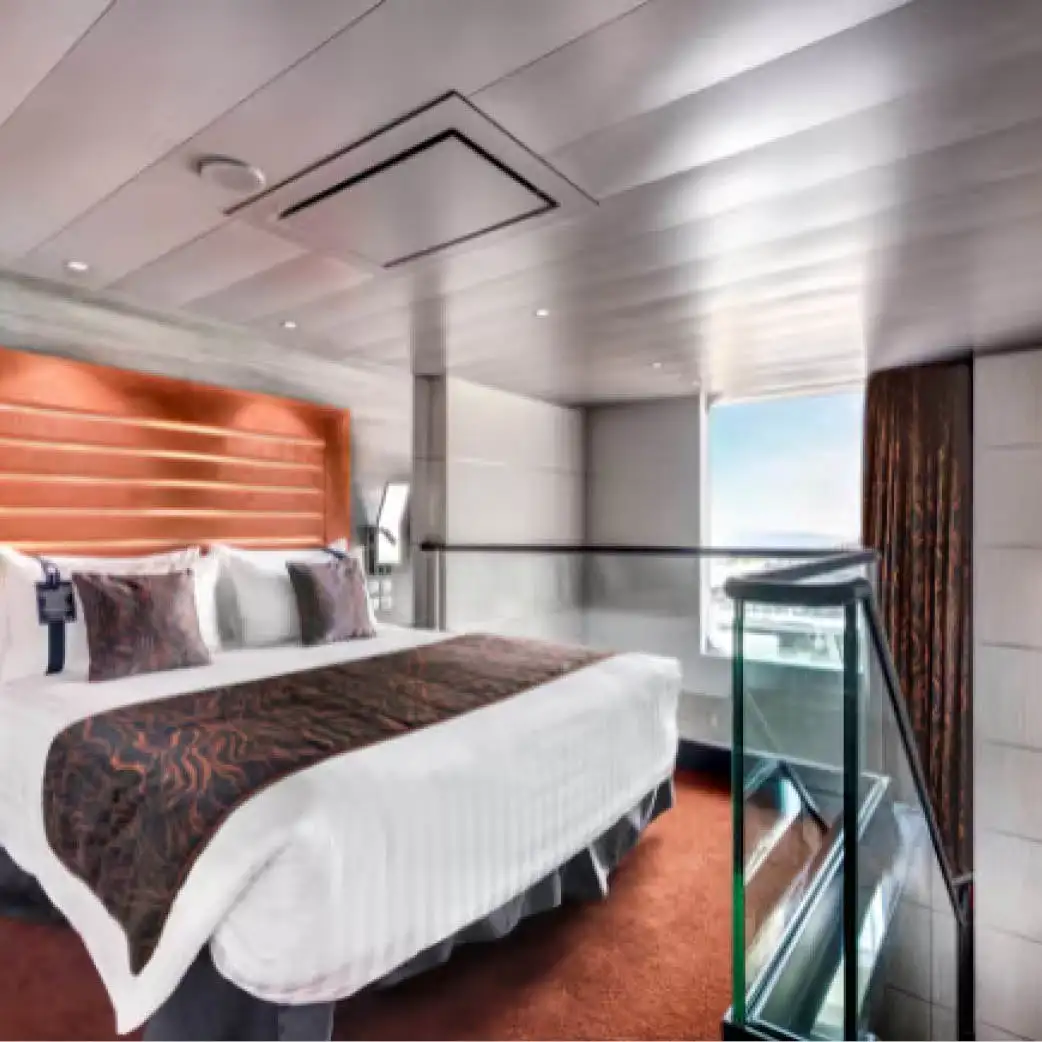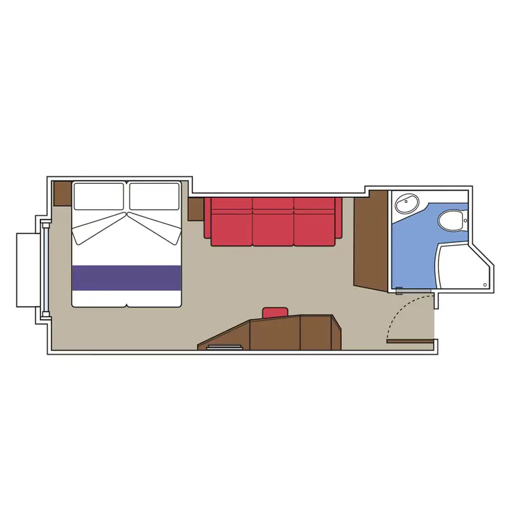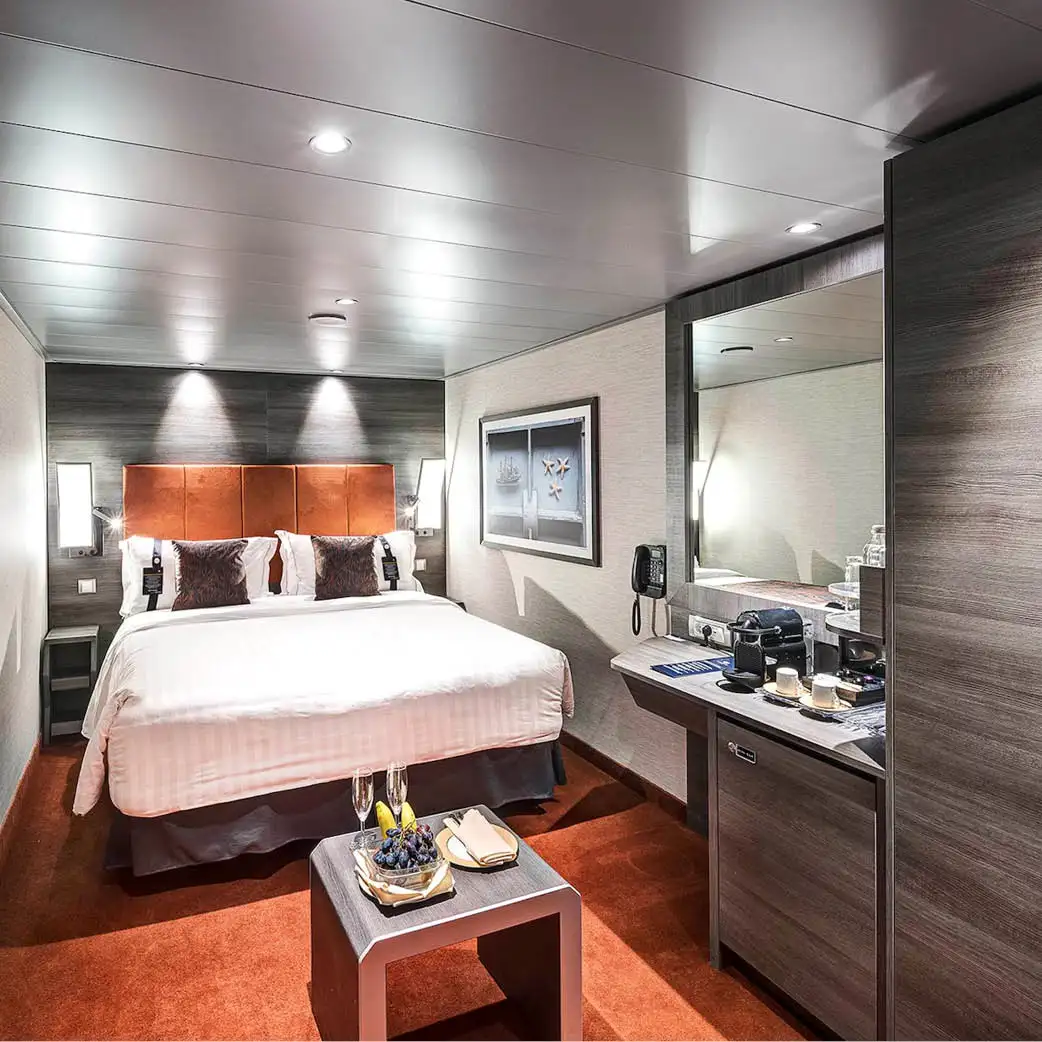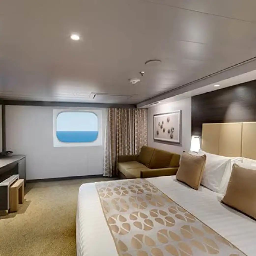 Incluyen baño privado con ducha, secador de pelo, armario, cama doble (convertible en dos individuales bajo petición), TV interactiva, minibar, caja fuerte y aire acondicionado. Algunas versiones tienen “ventana panorámica deslizante” que se convierte en barandilla de vidrio cuando se abre — lo que da una experiencia casi de balcón, aunque esté considerada como cabina exterior.