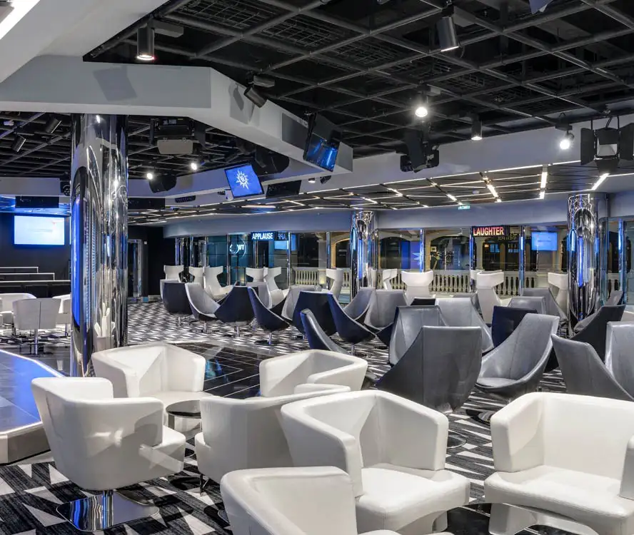 Con retransmisiones en directo accesibles desde cualquier parte del barco, nuestra emisora de radio y estudio de televisión emitirá juegos en directo y concursos de talentos y de conocimientos, entre otros divertidos contenidos. La excelente selección de cócteles, cervezas, vinos y refrescos que encontrarás a tu disposición te pondrá a tono antes de tu gran actuación.