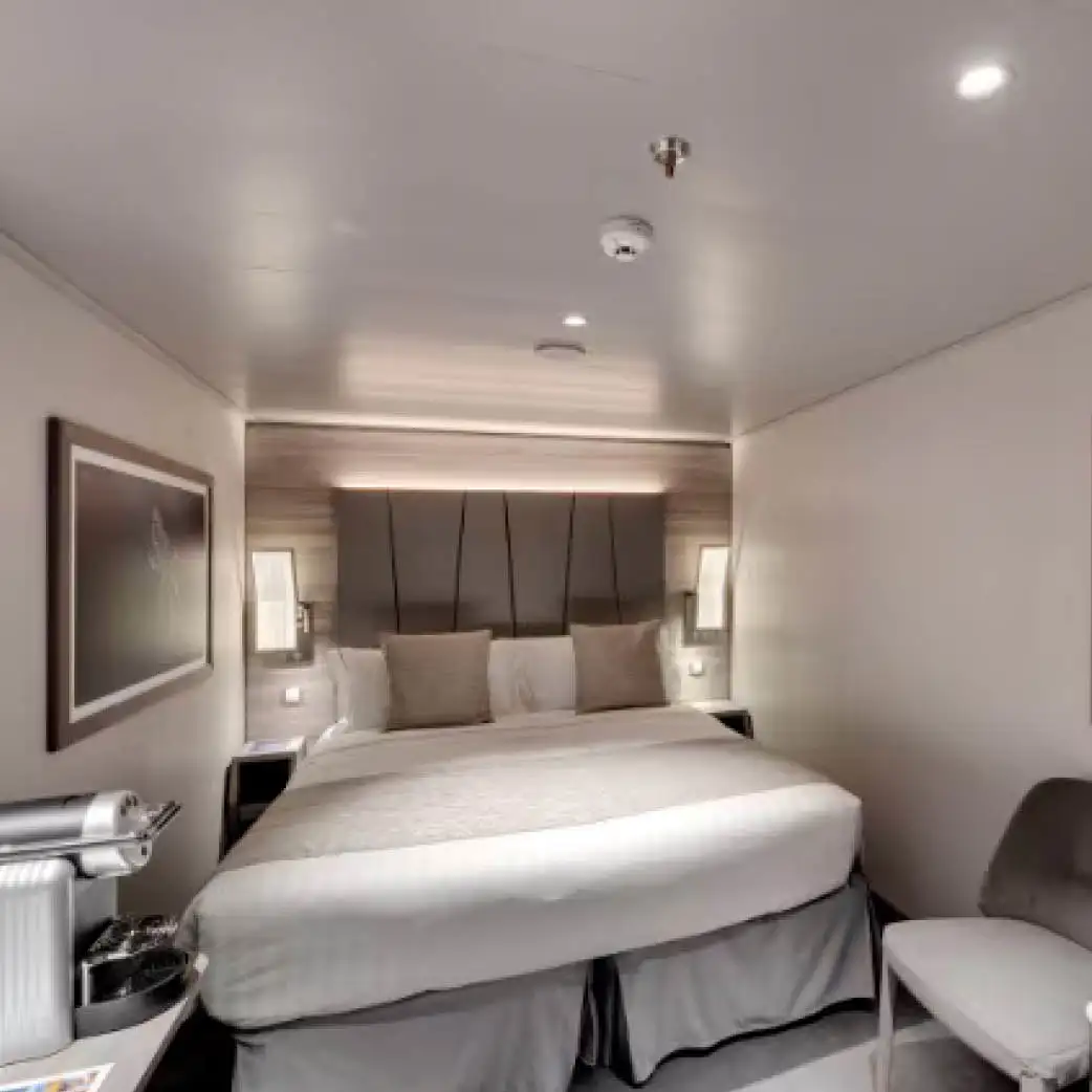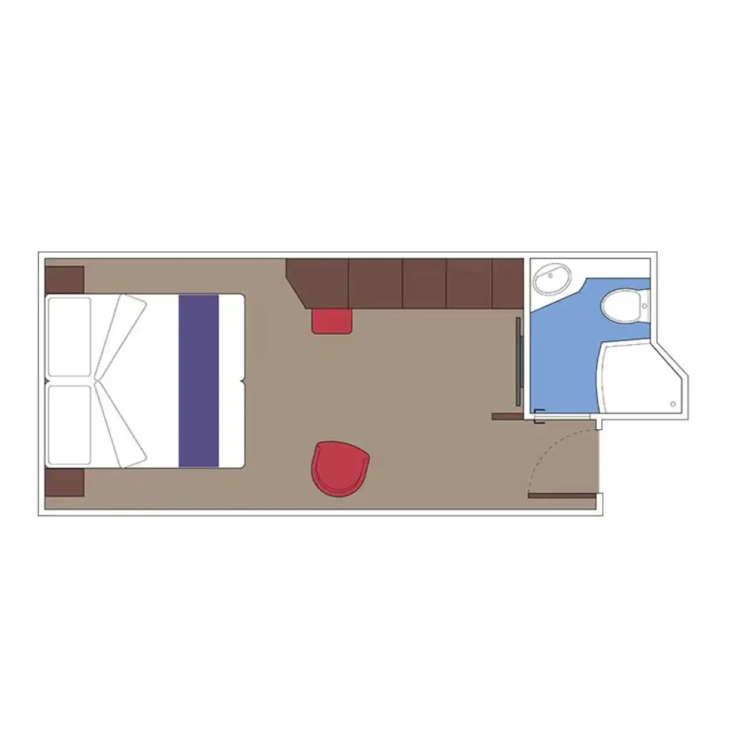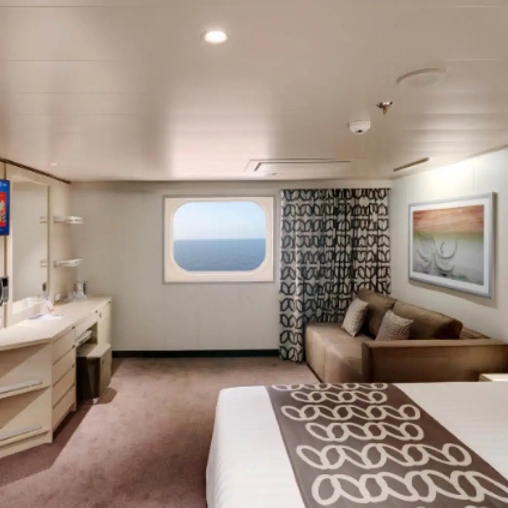 Incluyen baño privado con ducha, secador de pelo, armario, cama doble (convertible en dos individuales bajo petición), TV interactiva, minibar, caja fuerte y aire acondicionado. Algunas versiones tienen “ventana panorámica deslizante” que se convierte en barandilla de vidrio cuando se abre — lo que da una experiencia casi de balcón, aunque esté considerada como cabina exterior.