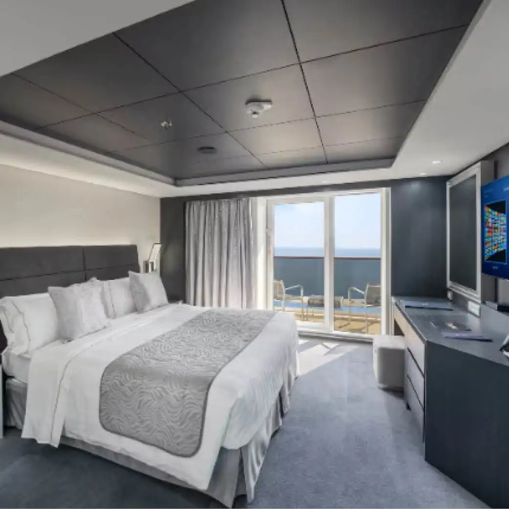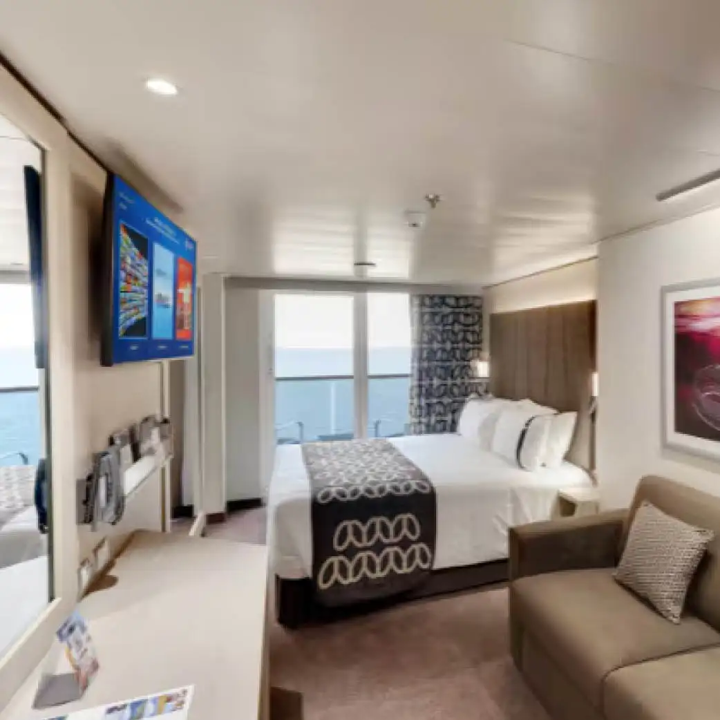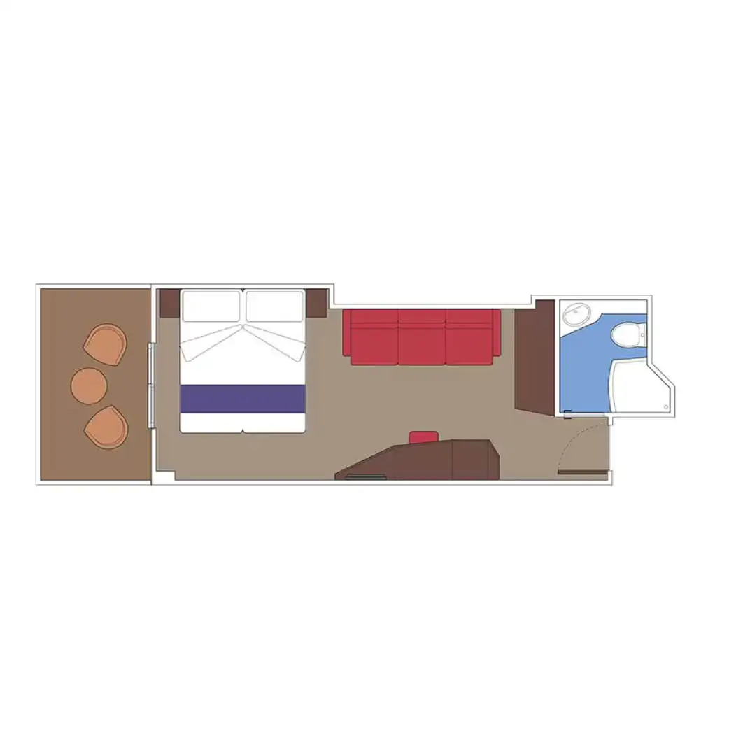 Incluyen baño privado con ducha, secador de pelo, armario, cama doble (convertible en dos individuales bajo petición), TV interactiva, minibar, caja fuerte y aire acondicionado. Algunas versiones tienen “ventana panorámica deslizante” que se convierte en barandilla de vidrio cuando se abre — lo que da una experiencia casi de balcón, aunque esté considerada como cabina exterior.