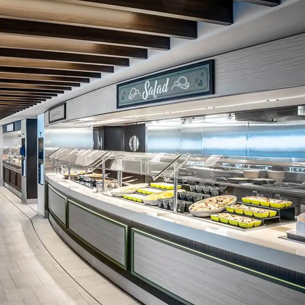 La extensa área de buffet incluye varios rincones multifunción que sirven platos internacionales, cocina étnica, opciones saludables y una multitud de otros sabores. Es el lugar ideal para disfrutar de una excelente experiencia gastronómica informal con una espectacular vista al mar.