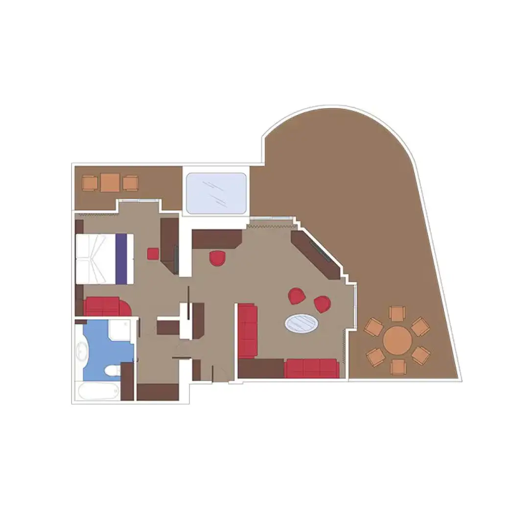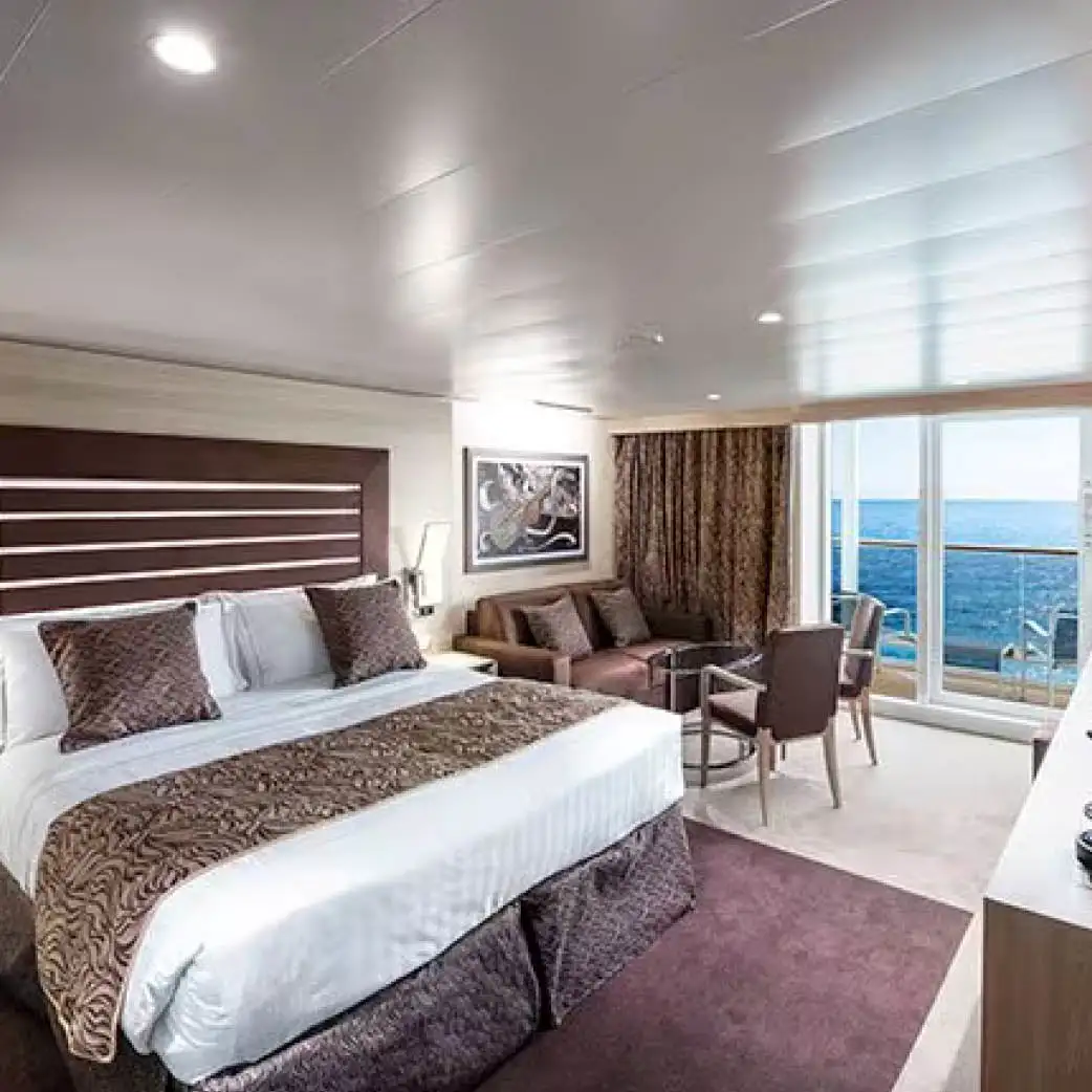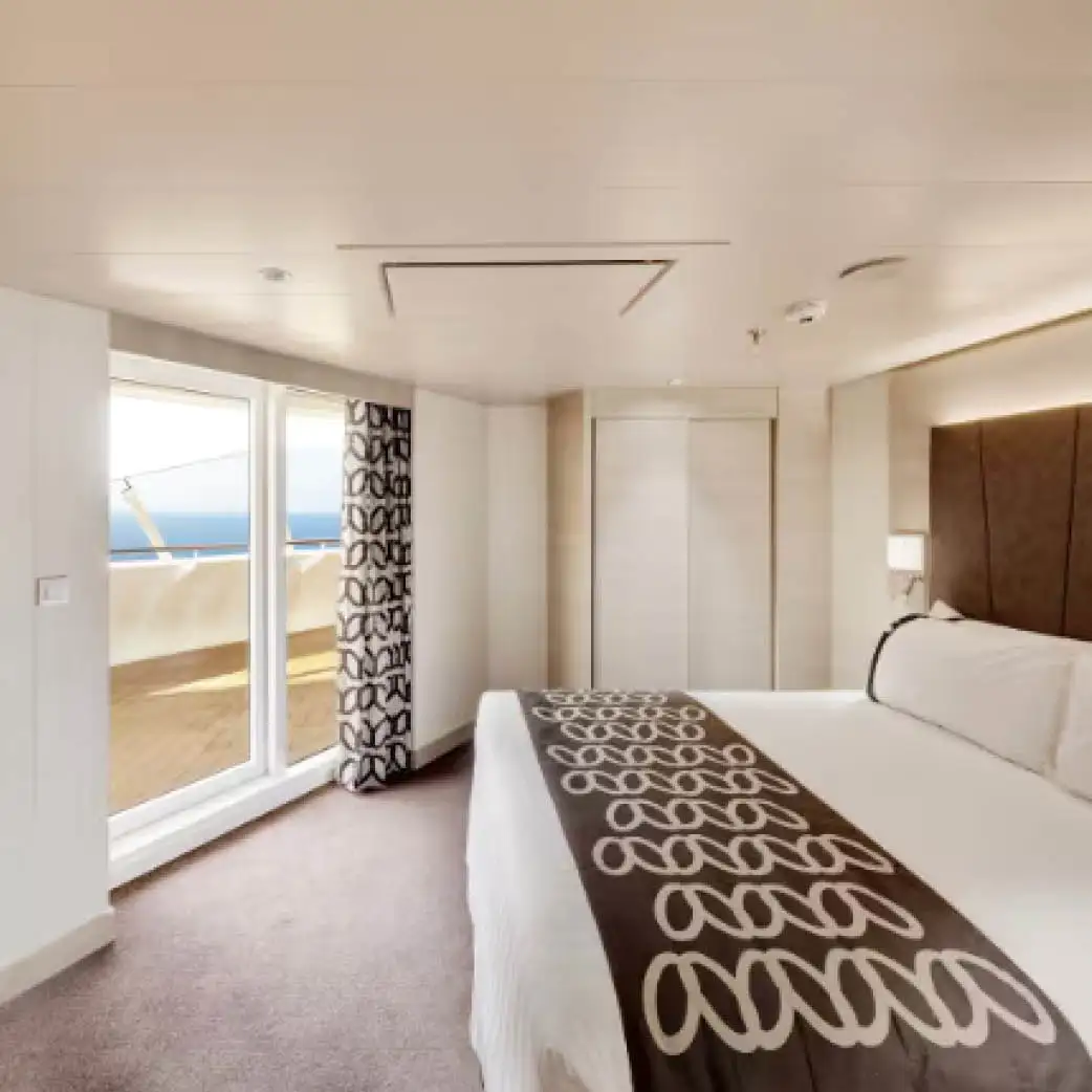 Las suites Aurea en el MSC Euribia ofrecen un nivel elevado de confort y espacio, ideal para quienes buscan algo más que una cabina estándar sin entrar a la categoría de lujo del Yacht Club. Estas suites se ubican en diferentes cubiertas del barco, cuentan con balcón privado en muchas de ellas, y disponen de prestaciones de calidad como cama doble convertible en camas individuales bajo petición, sofá-cama o zona de descanso, minibar, TV interactiva, caja fuerte, aire acondicionado y baño privado con ducha (y en algunos casos bañera).