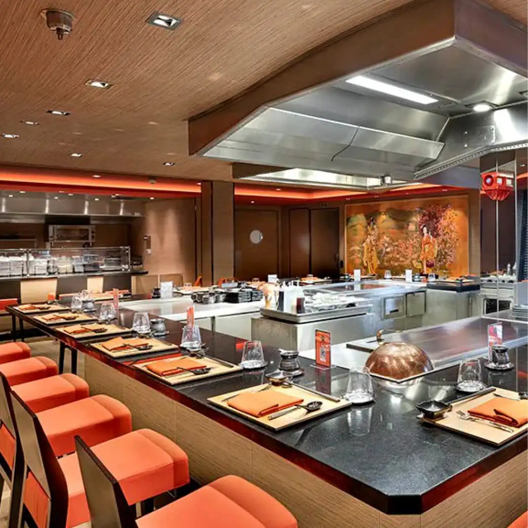 Entra, elige tu lugar en una de las cuatro estaciones de cocina y observa cómo tus deliciosos platos japoneses cobran vida justo ante tus ojos. Nuestros expertos chefs cocinan con estilo en una parrilla abierta: un festín para los sentidos en el que las llamas y los mejores ingredientes se unen para formar platos deliciosos que recordarás para siempre.