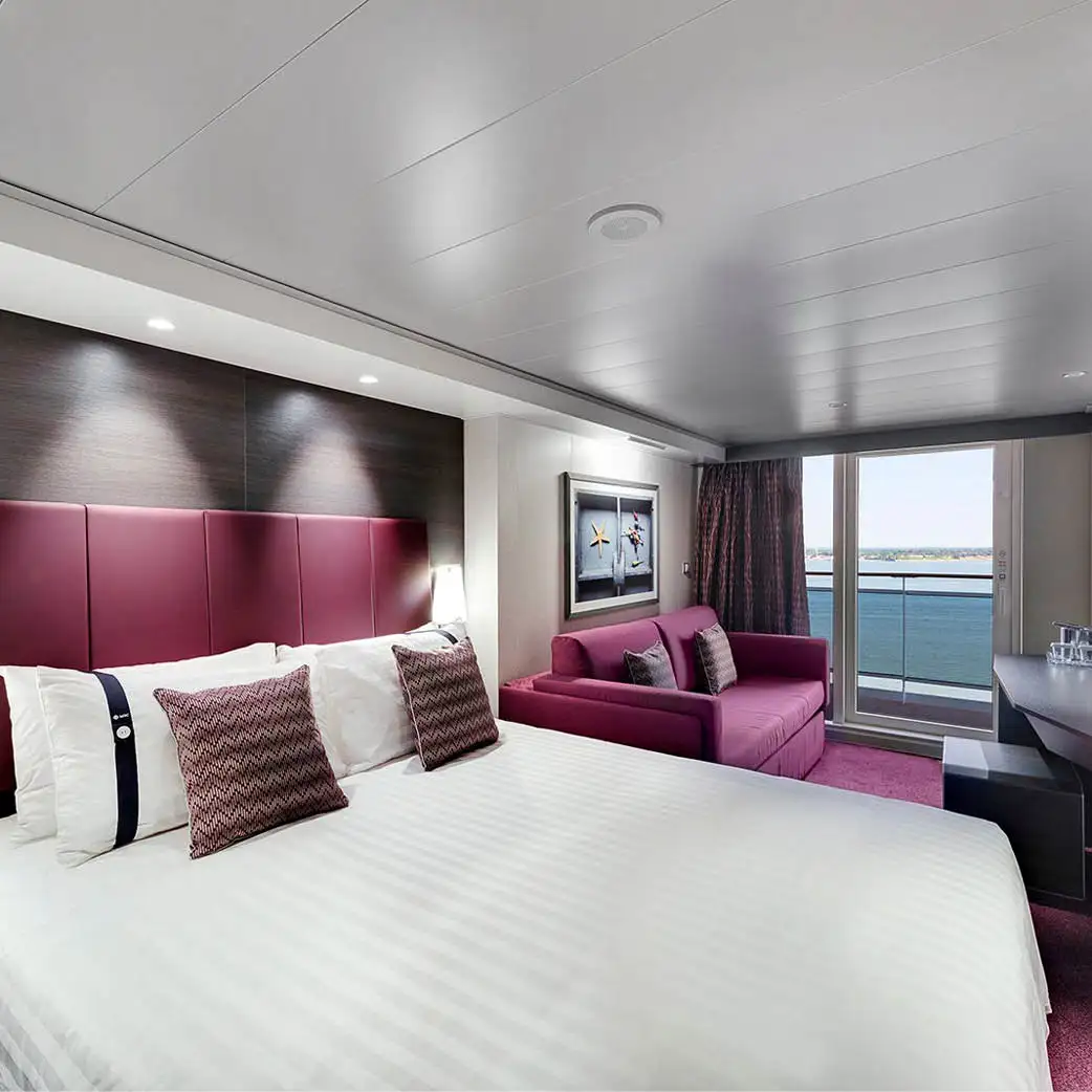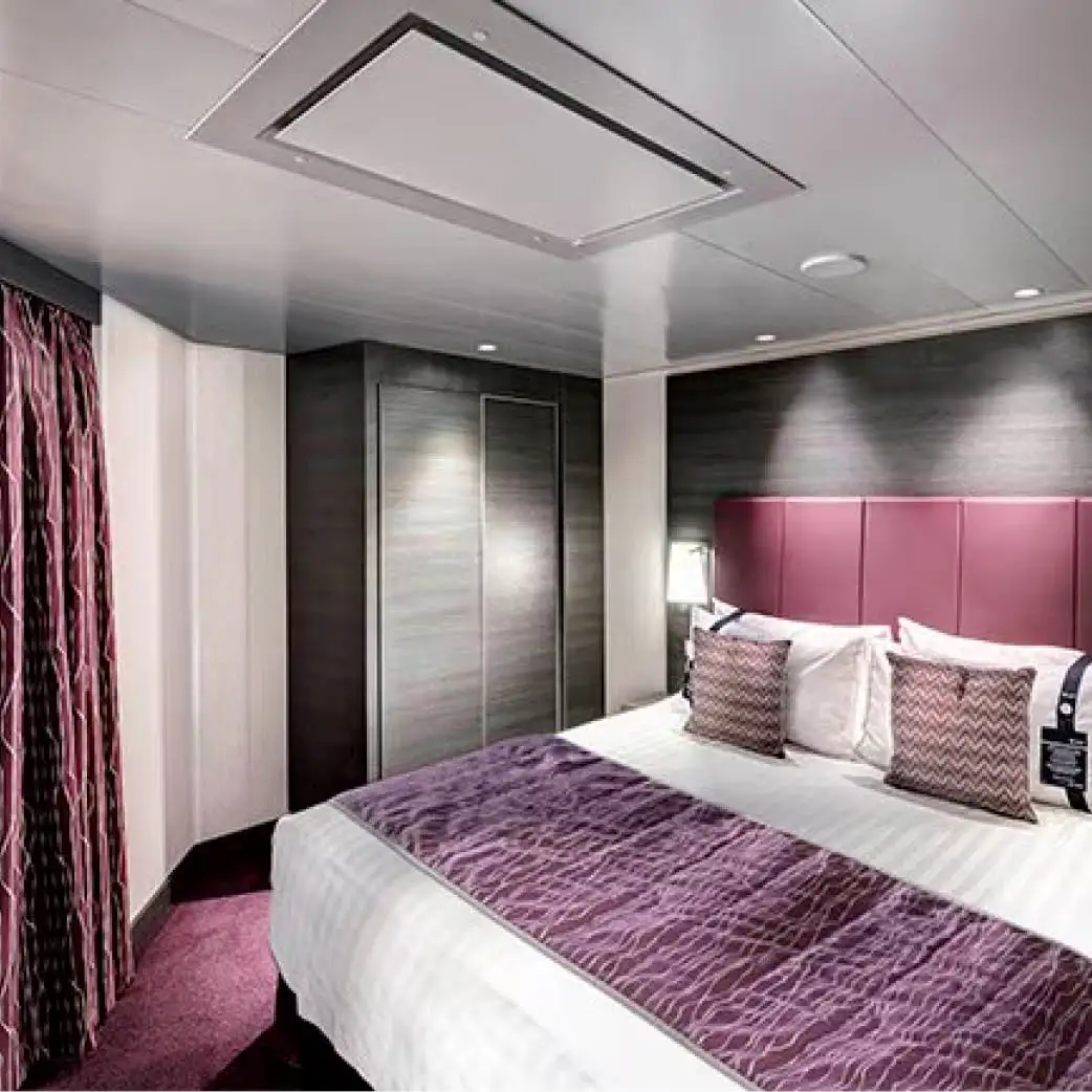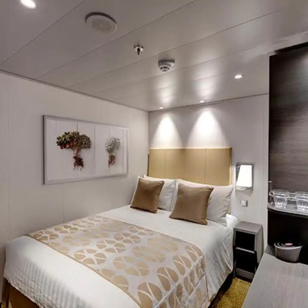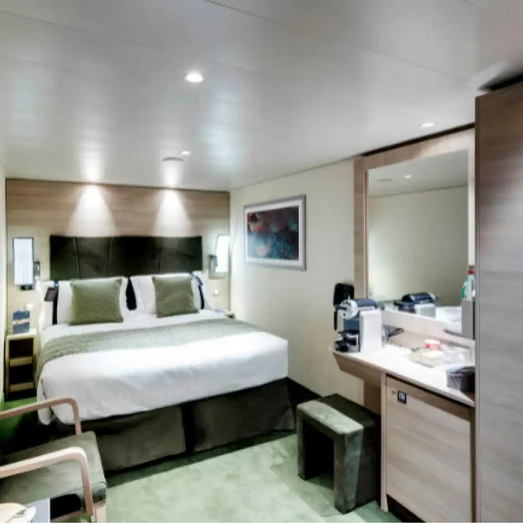 Incluyen baño privado con ducha, secador de pelo, armario, cama doble (convertible en dos individuales bajo petición), TV interactiva, minibar, caja fuerte y aire acondicionado. Algunas versiones tienen “ventana panorámica deslizante” que se convierte en barandilla de vidrio cuando se abre — lo que da una experiencia casi de balcón, aunque esté considerada como cabina exterior.