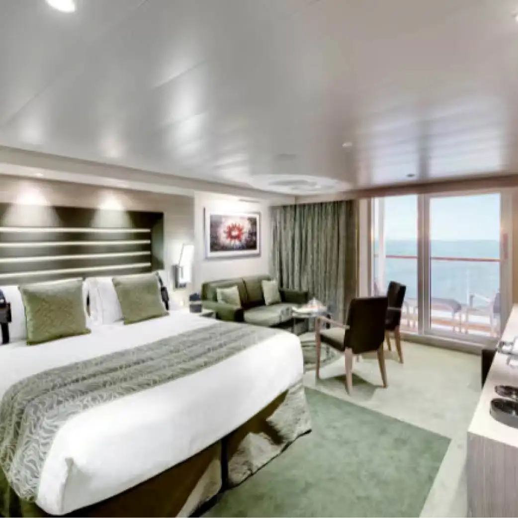 Las suites Aurea en el MSC Grandiosa ofrecen un nivel elevado de confort y espacio, ideal para quienes buscan algo más que una cabina estándar sin entrar a la categoría de lujo del Yacht Club. Estas suites se ubican en diferentes cubiertas del barco, cuentan con balcón privado en muchas de ellas, y disponen de prestaciones de calidad como cama doble convertible en camas individuales bajo petición, sofá-cama o zona de descanso, minibar, TV interactiva, caja fuerte, aire acondicionado y baño privado con ducha (y en algunos casos bañera).