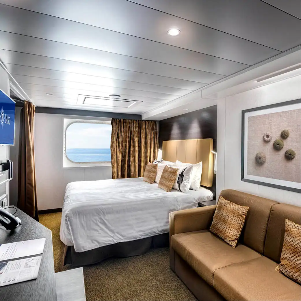 Los camarotes exteriores en el MSC Grandiosa ofrecen una opción intermedia entre las cabinas interiores sin ventana y las que tienen balcón. Son ideales si deseas disfrutar de la luz natural y de la vista al mar sin subir al coste adicional de una terraza privada.