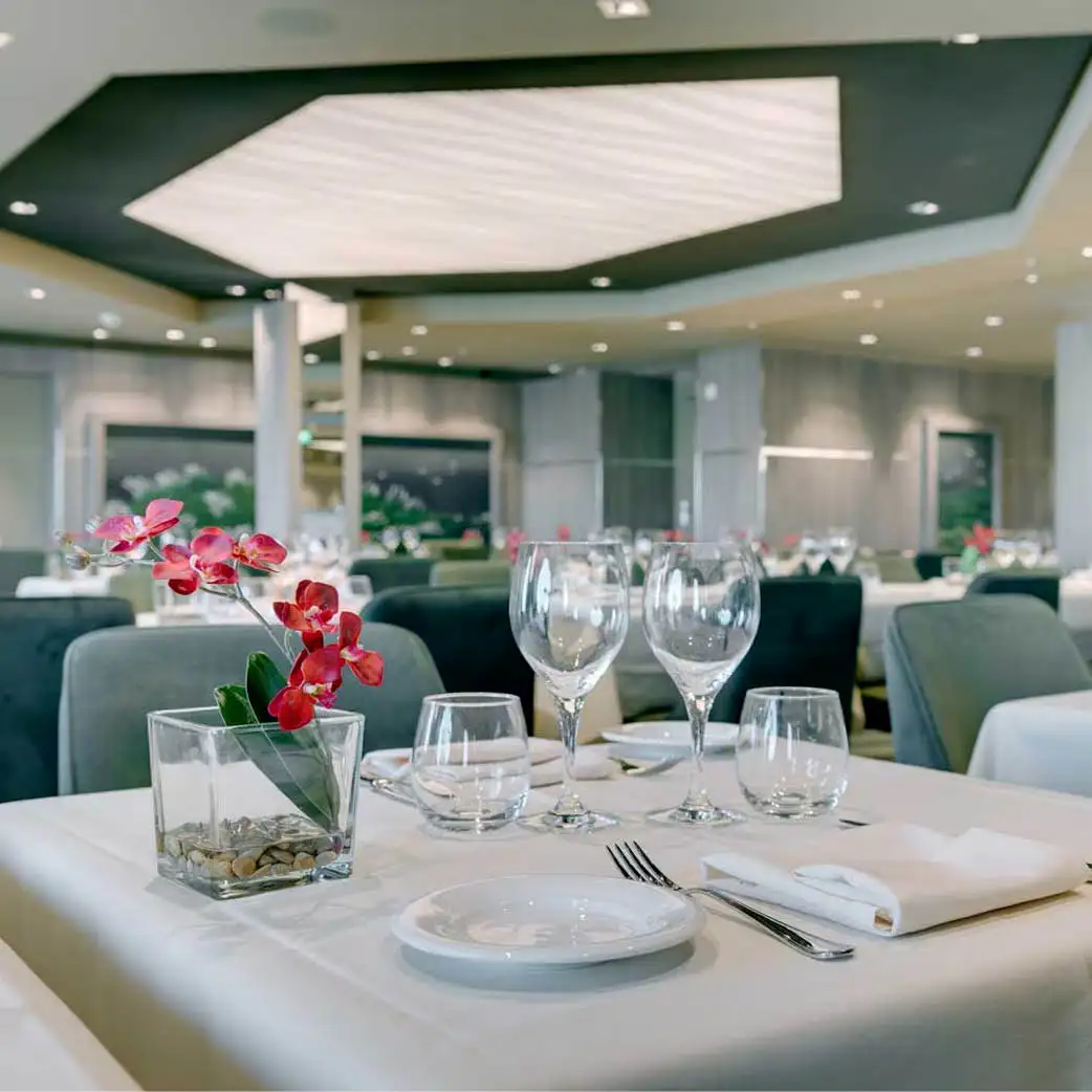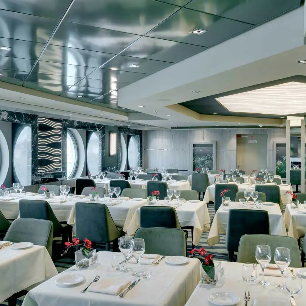 La Perle Grise es un restaurante principal incluido, situado también en la cubierta 6. Comparte estilo y carta con La Perla Grigia: cocina internacional y mediterránea con menús que cambian cada día. Su diseño es moderno y elegante, con una paleta de colores grises y plateados que le da un aire sofisticado. Ambos restaurantes están conectados por un pasillo central y ofrecen cenas en turnos asignados o modalidades flexibles según el tipo de reserva del pasajero.