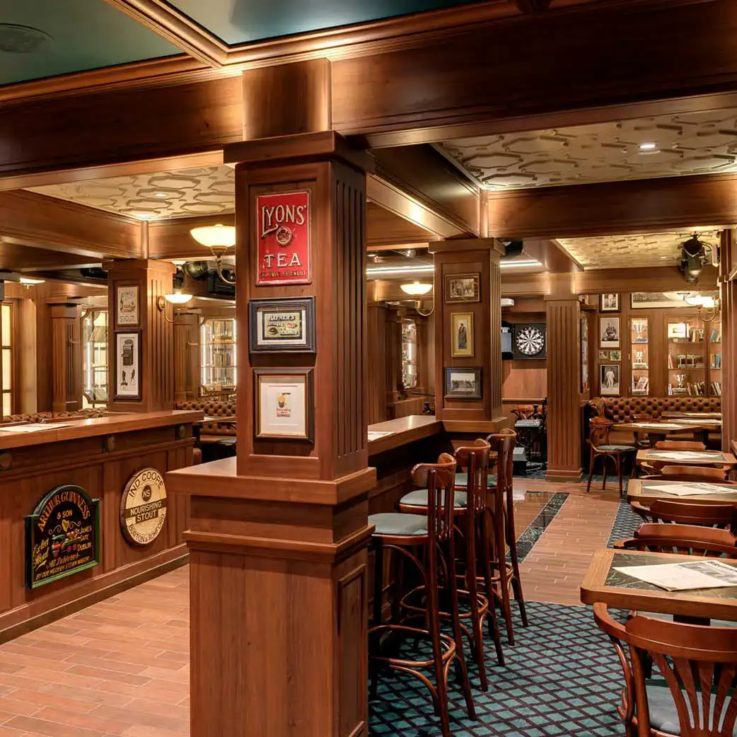 Animado y carismático, nuestro tradicional pub inglés es el sitio ideal para pasar un buen rato y disfrutar de una rica pinta de cerveza, de los mejores licores, o de un amplio abanico de cócteles a base de cerveza. Y si te entra hambre, puedes saborear nuestras hamburguesas, perritos y el tradicional fish and chips rebozado en cerveza elaborado con los mejores ingredientes por nuestros talentosos chefs.