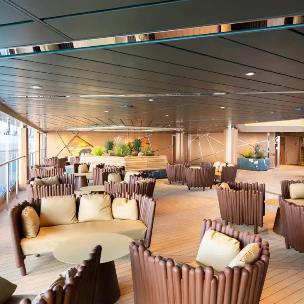 Disfruta de unas vistas espectaculares desde este elegante salón, con una oferta de licores, cócteles artesanales, cervezas, vinos, refrescos y cafés exclusiva para los socios de MSC Yacht Club. También podrás saborear una deliciosa selección de pinchos gourmet a lo largo del día.
