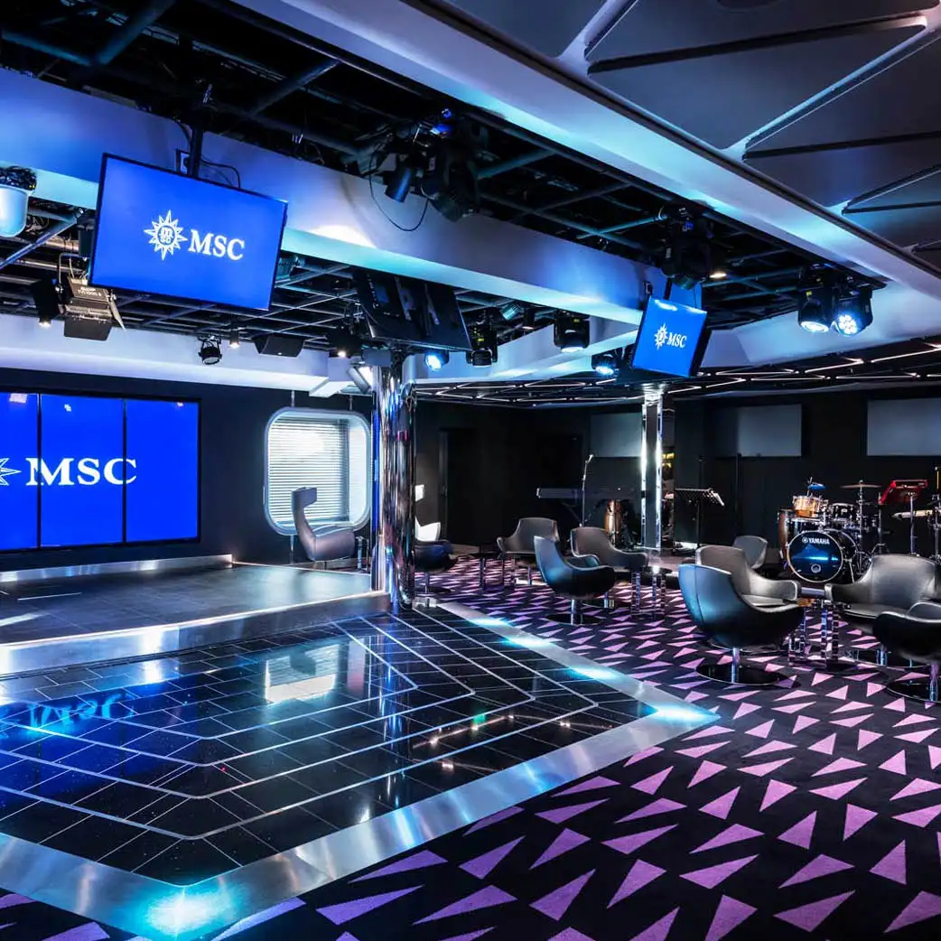 ¡Transmite en directo por todo el barco! nuestro estudio de televisión y de radio transmiten juegos en vivo, concursos y otros espectáculos. En este bar encontrarás una excelente selección de cócteles, cerveza, vinos y refrescos para preparate para tu gran actuación.