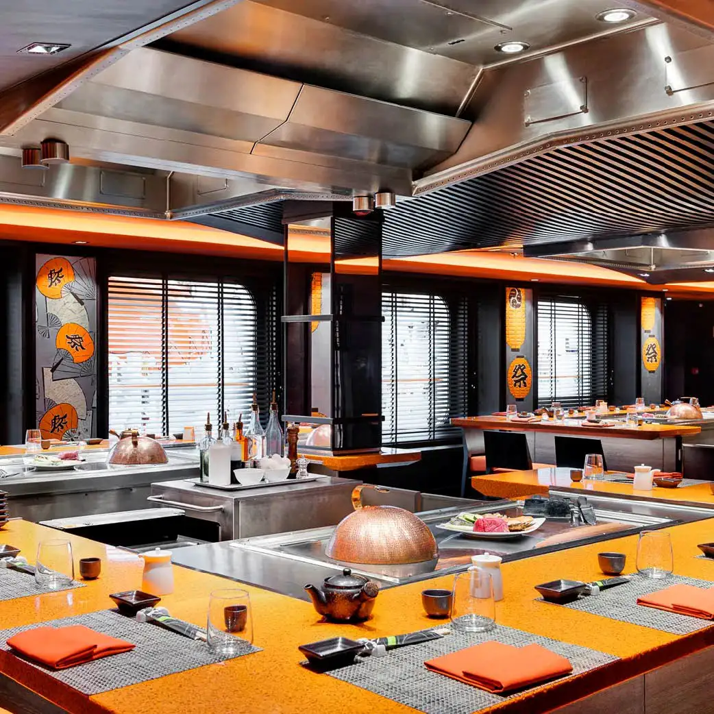 Un estiloso restaurante especializado en teppanyaki. Elige tu sitio en una de las cuatro zonas de cocina, y contempla cómo se van haciendo realidad ante tus propios ojos los platos más deliciosos de la gastronomía japonesa. Nuestros expertos chefs cocinan con estilo en una parrilla abierta, creando un auténtico festival para los sentidos que, gracias a las llamas y a los mejores y más crujientes ingredientes, da forma a unos platos exquisitos que no olvidarás jamás.