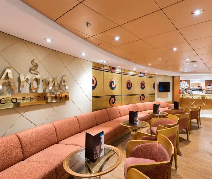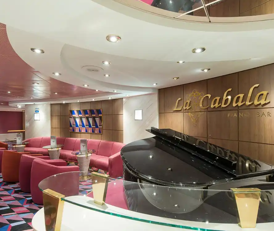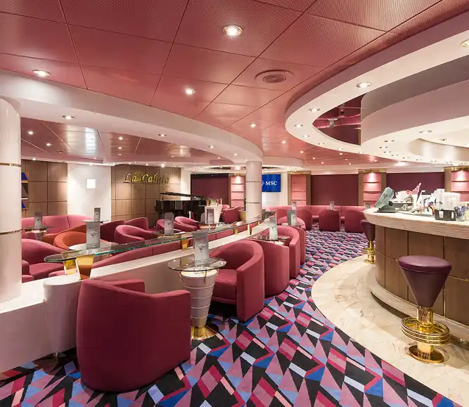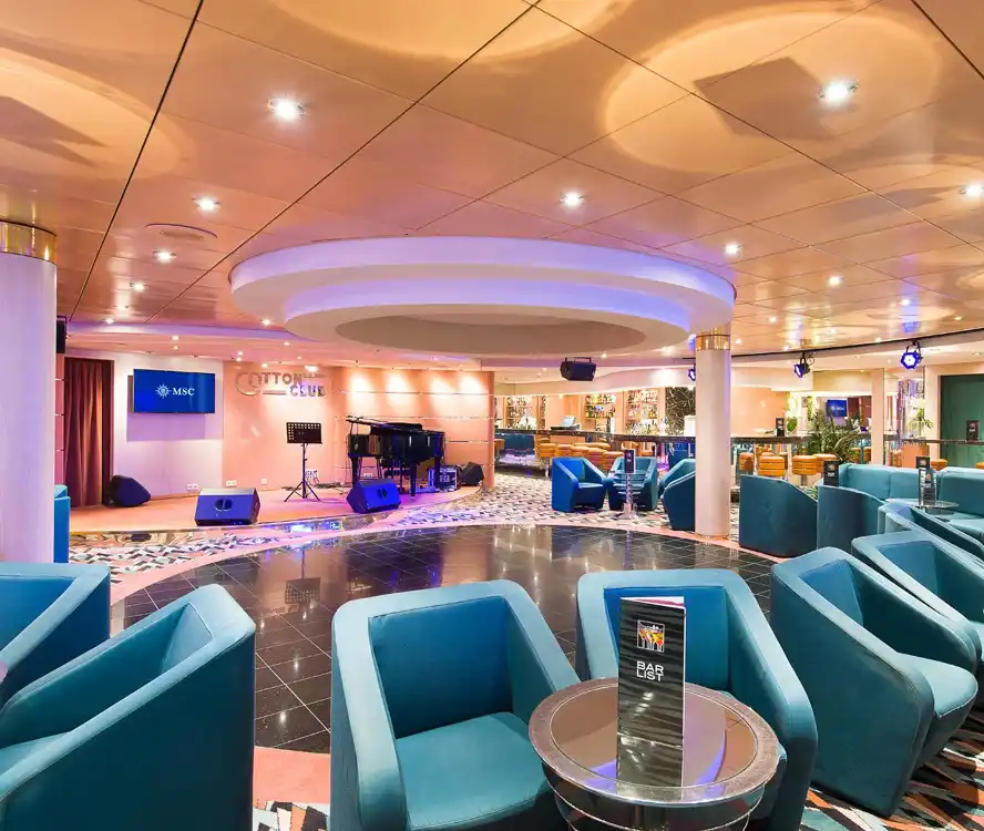 En el MSC Opera encontrarás una amplia variedad de bares, lounges y cafés para todos los momentos. Destacan el Cotton Club con pista de baile y música en vivo, el Aroma Coffee Bar para cafés y dulces en un ambiente tranquilo, el La Cabala Piano Bar con piano y ambiente sofisticado, el británico Sottovento Pub con gran selección de cervezas y zona de fumadores, y el animado Byblos Discoteca para bailar hasta tarde. Además, cuenta con bares al aire libre como el Il Patio Bar junto a la piscina y el Vitamin Bar para batidos y bebidas saludables.