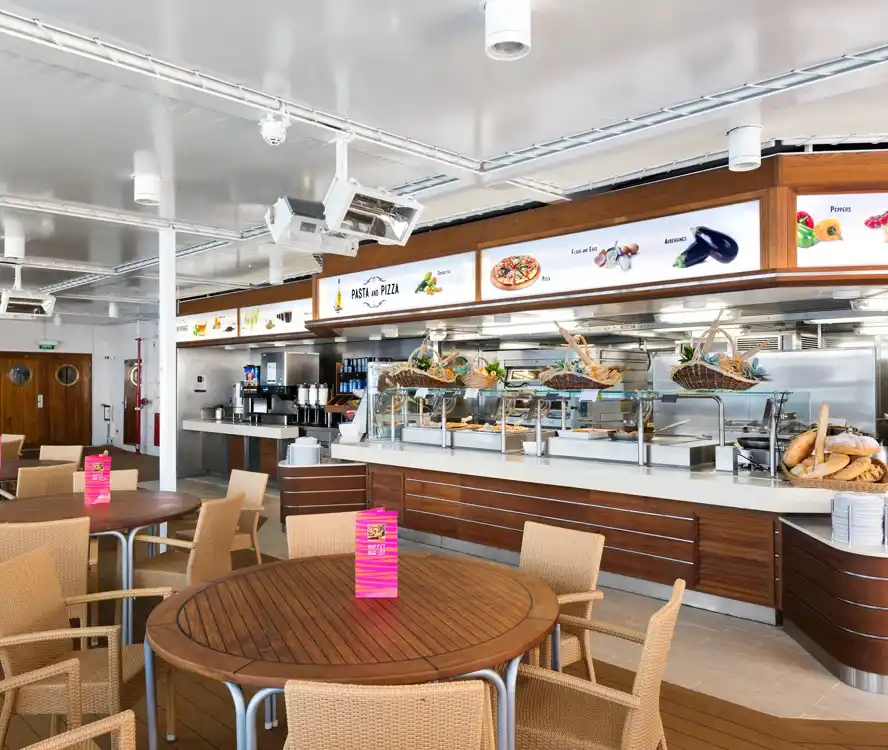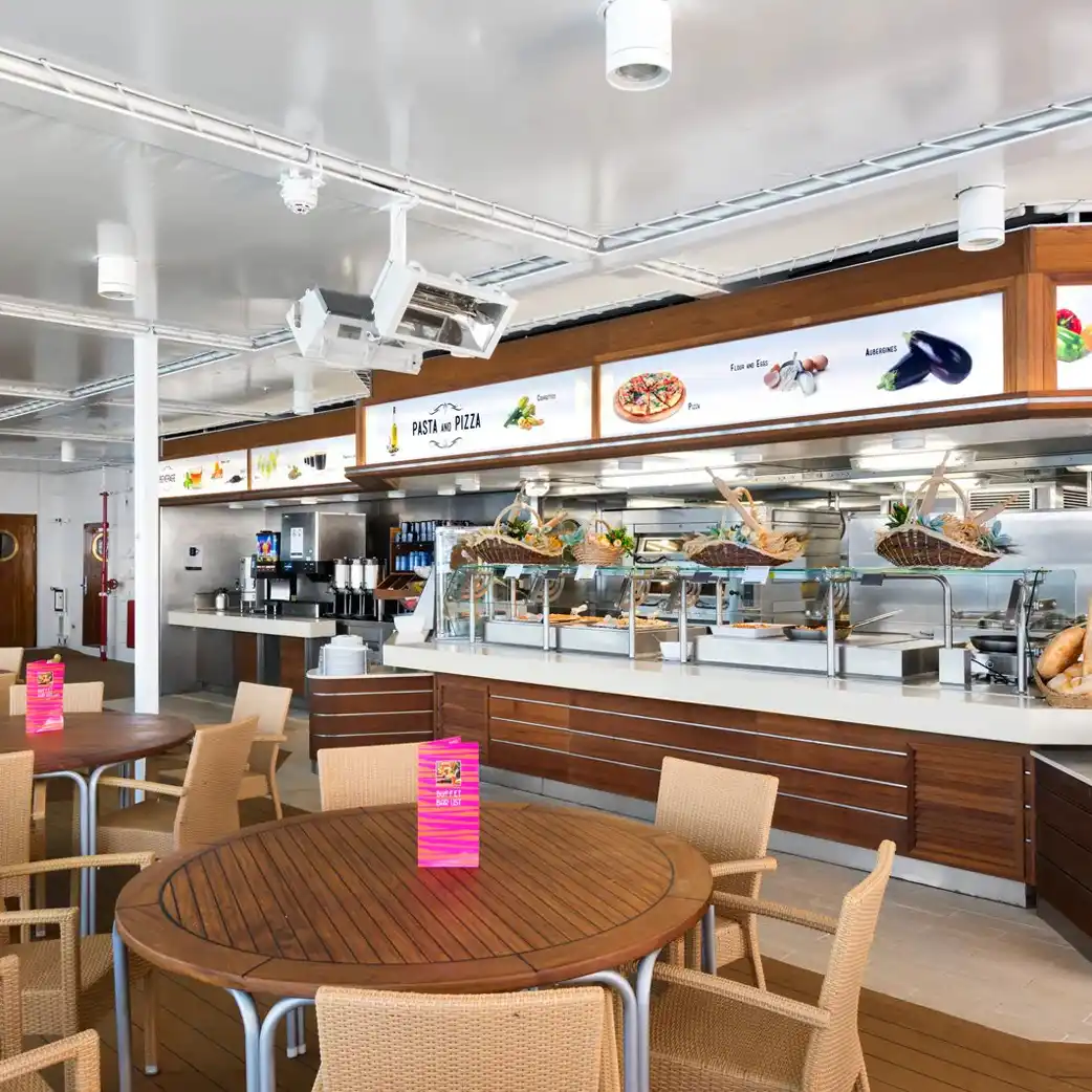 El Buffet Le Vele a bordo del MSC Opera ofrece una amplia variedad de platos internacionales y mediterráneos en un ambiente informal. Ideal para comidas rápidas o familiares, permite a los pasajeros disfrutar de estaciones de cocina en vivo, pizzas, pastas y opciones frescas, con libertad para escoger y saborear frente al mar.