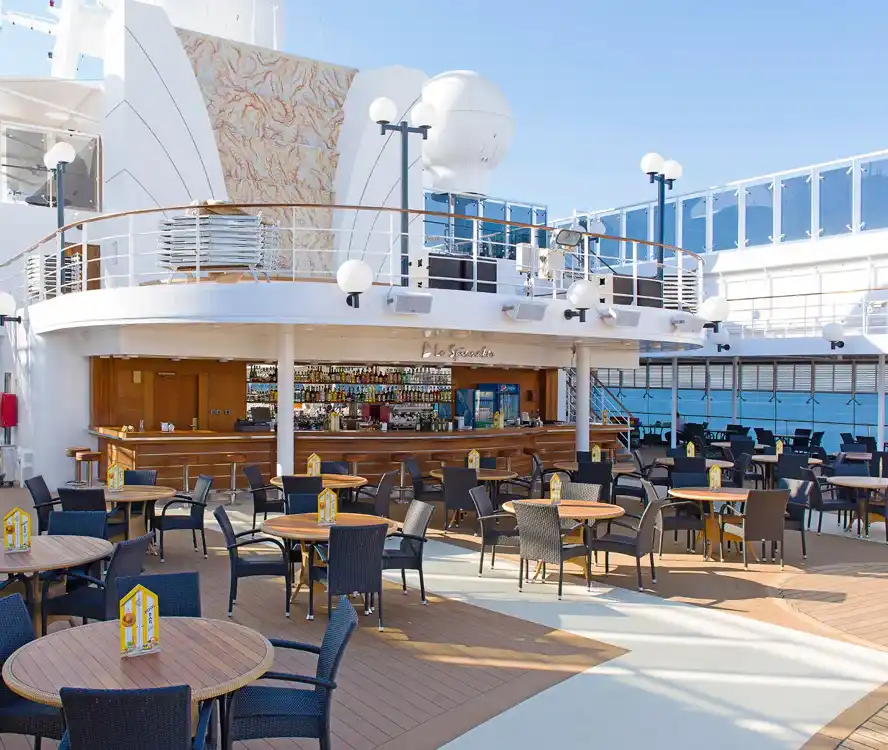 El Il Patio Bar en el MSC Opera es un espacio acogedor y relajado donde los pasajeros pueden disfrutar de bebidas refrescantes, cócteles y aperitivos ligeros. Ideal para socializar o descansar, ofrece un ambiente informal con vistas al mar, perfecto para acompañar momentos de ocio y relax durante el día o la noche.