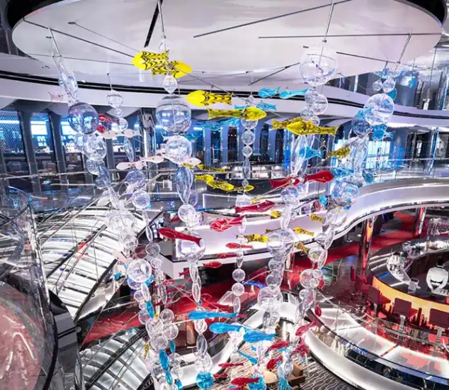 La escultura Danza del Mare, creada para la Fundación MSC en colaboración con Venini, celebra el 100º aniversario del renombrado fabricante de vidrio. Situada en el Centro de la Fundación MSC, se eleva de la cubierta 5 a la 8, rodeada de espejos que multiplican su luz y colores, iluminada desde la base. MSC Seashore es el escenario perfecto, llevando su mensaje de cuidado del mar a miles de pasajeros mientras navega entre las maravillas y el esplendor infinito de los océanos.