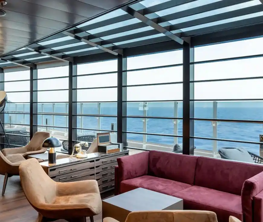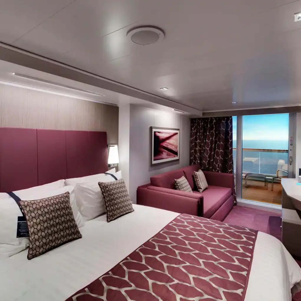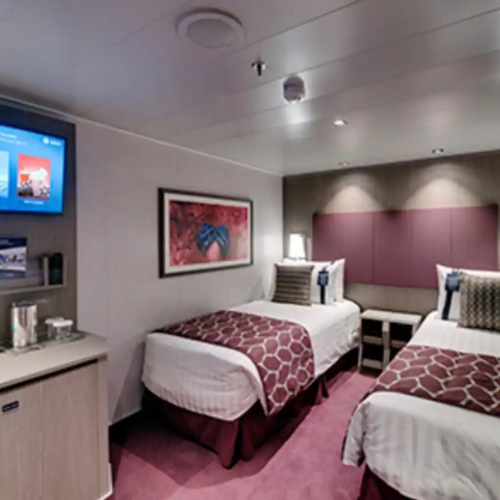 Incluyen baño privado con ducha, secador de pelo, armario, cama doble (convertible en dos individuales bajo petición), TV interactiva, minibar, caja fuerte y aire acondicionado. Algunas versiones tienen “ventana panorámica deslizante” que se convierte en barandilla de vidrio cuando se abre — lo que da una experiencia casi de balcón, aunque esté considerada como cabina exterior.