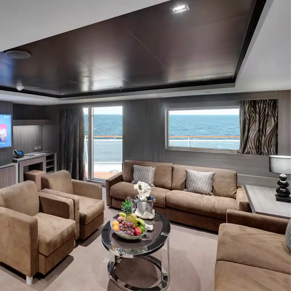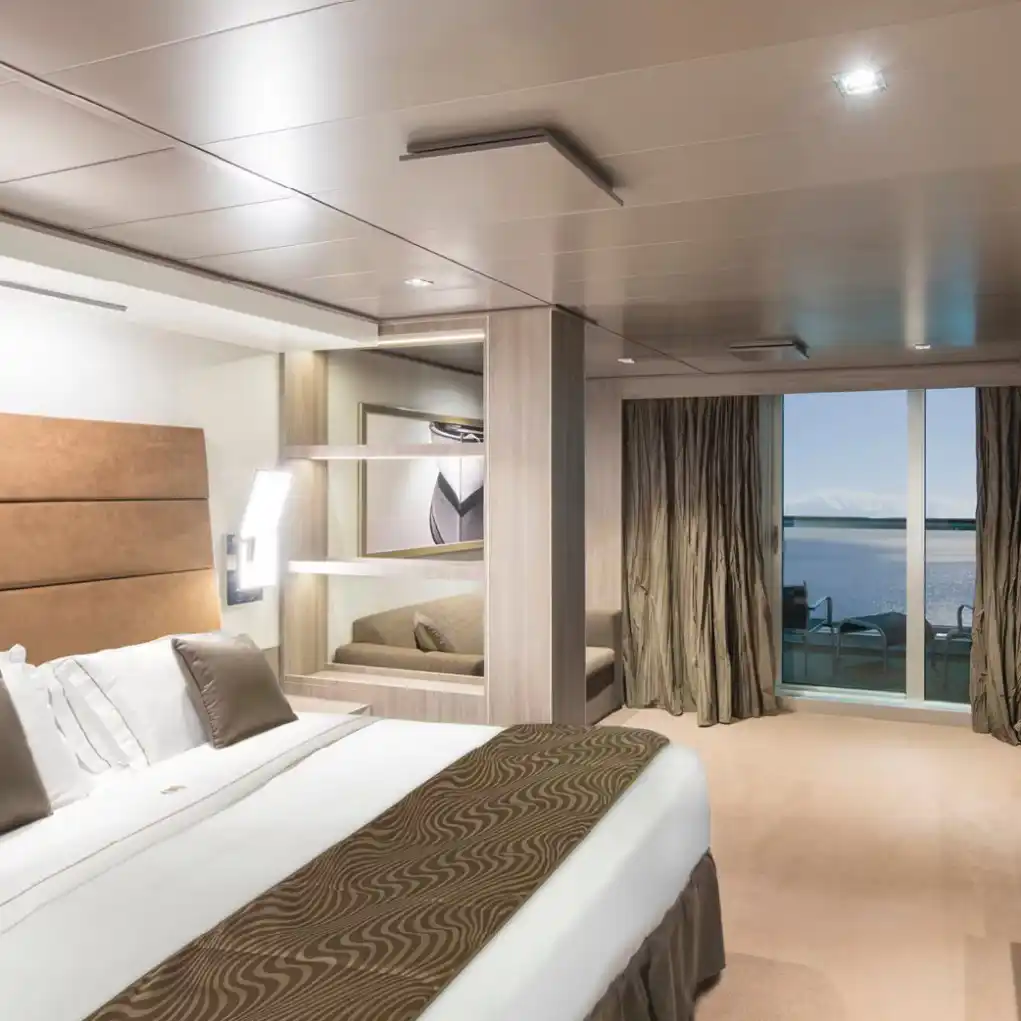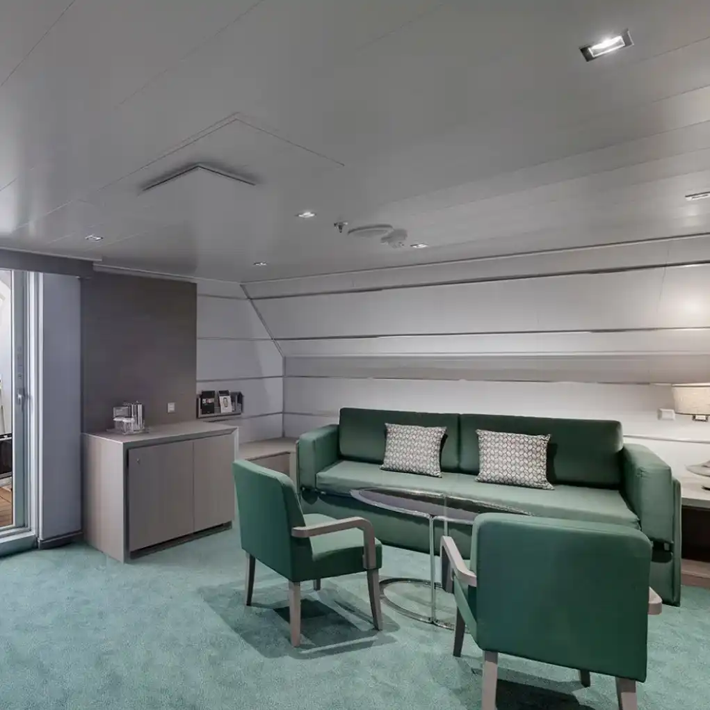 Las suites Aurea en el MSC Seascape ofrecen un nivel elevado de confort y espacio, ideal para quienes buscan algo más que una cabina estándar sin entrar a la categoría de lujo del Yacht Club. Estas suites se ubican en diferentes cubiertas del barco, cuentan con balcón privado en muchas de ellas, y disponen de prestaciones de calidad como cama doble convertible en camas individuales bajo petición, sofá-cama o zona de descanso, minibar, TV interactiva, caja fuerte, aire acondicionado y baño privado con ducha (y en algunos casos bañera).