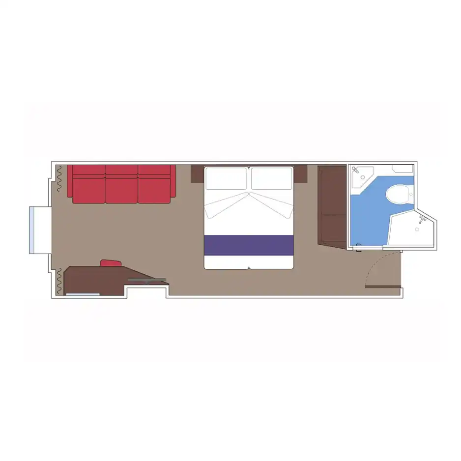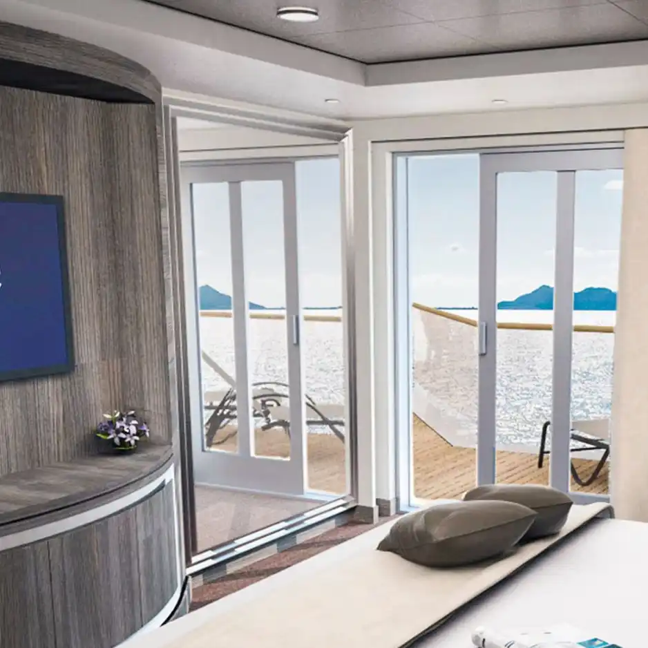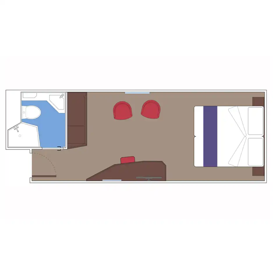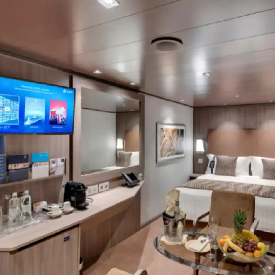 Incluyen baño privado con ducha, secador de pelo, armario, cama doble (convertible en dos individuales bajo petición), TV interactiva, minibar, caja fuerte y aire acondicionado. Algunas versiones tienen “ventana panorámica deslizante” que se convierte en barandilla de vidrio cuando se abre — lo que da una experiencia casi de balcón, aunque esté considerada como cabina exterior.