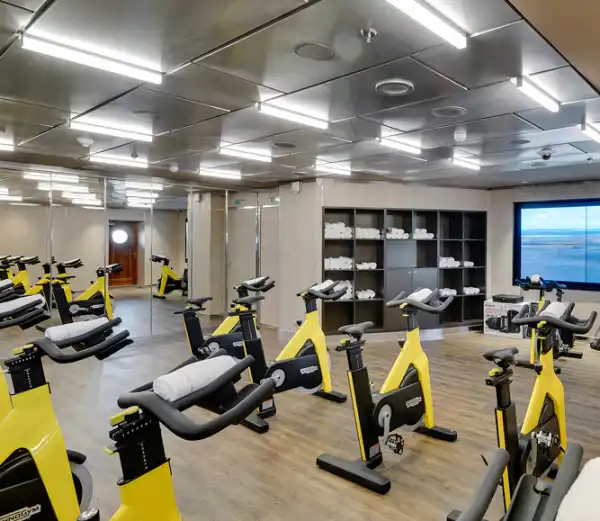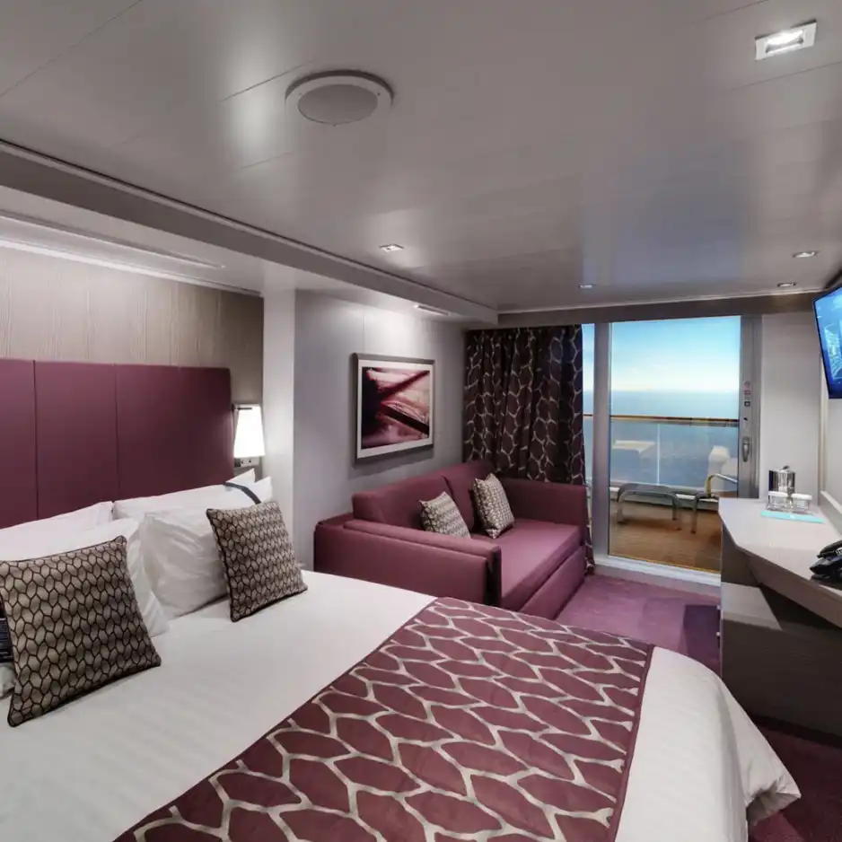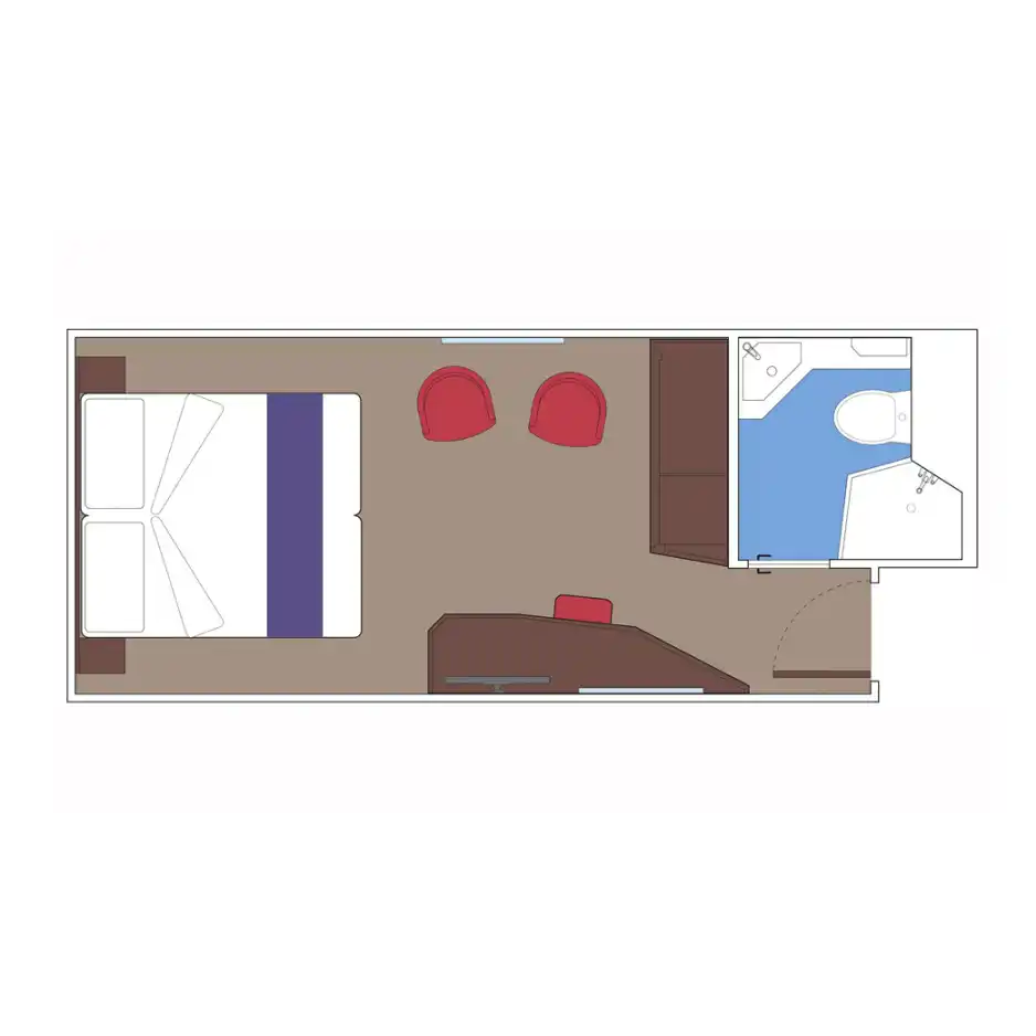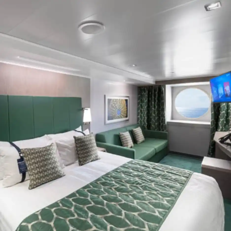 Incluyen baño privado con ducha, secador de pelo, armario, cama doble (convertible en dos individuales bajo petición), TV interactiva, minibar, caja fuerte y aire acondicionado. Algunas versiones tienen “ventana panorámica deslizante” que se convierte en barandilla de vidrio cuando se abre — lo que da una experiencia casi de balcón, aunque esté considerada como cabina exterior.