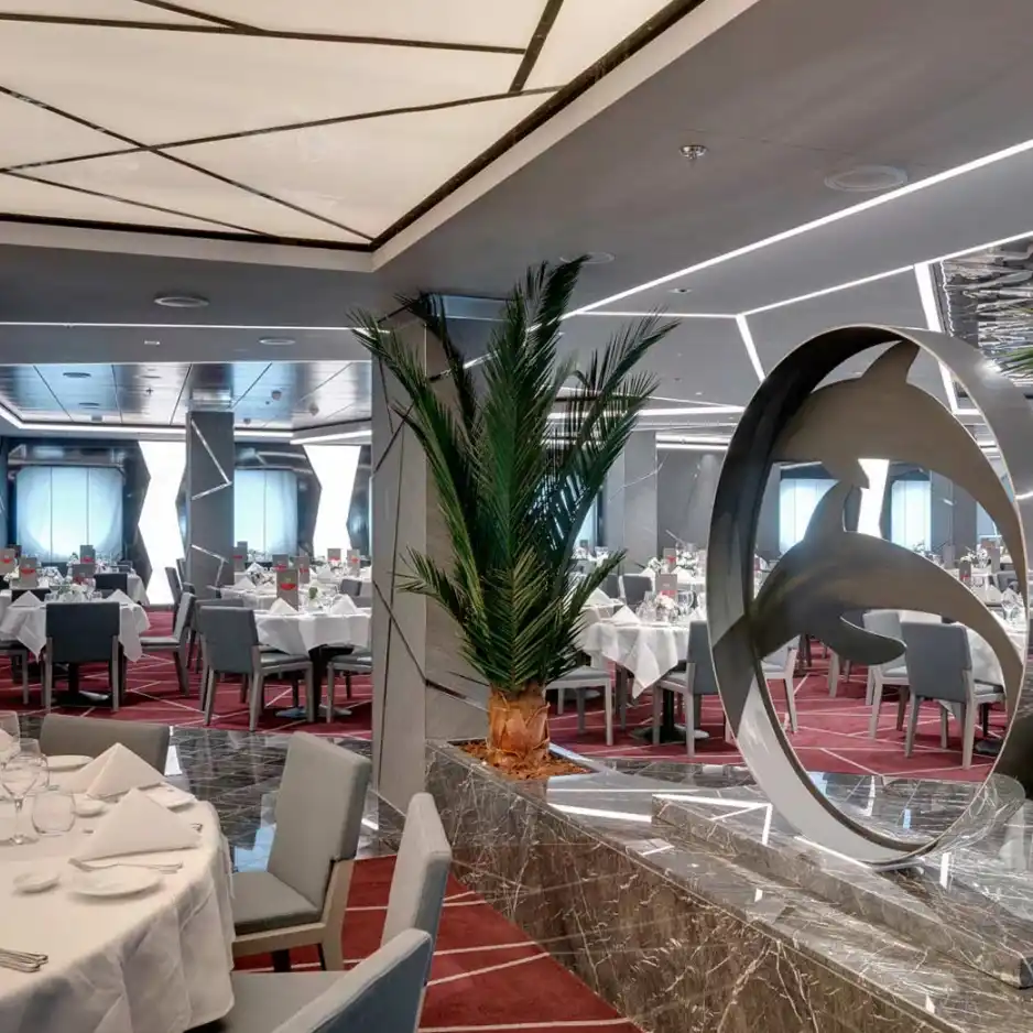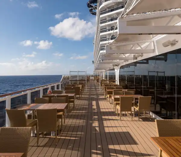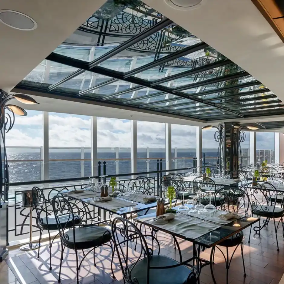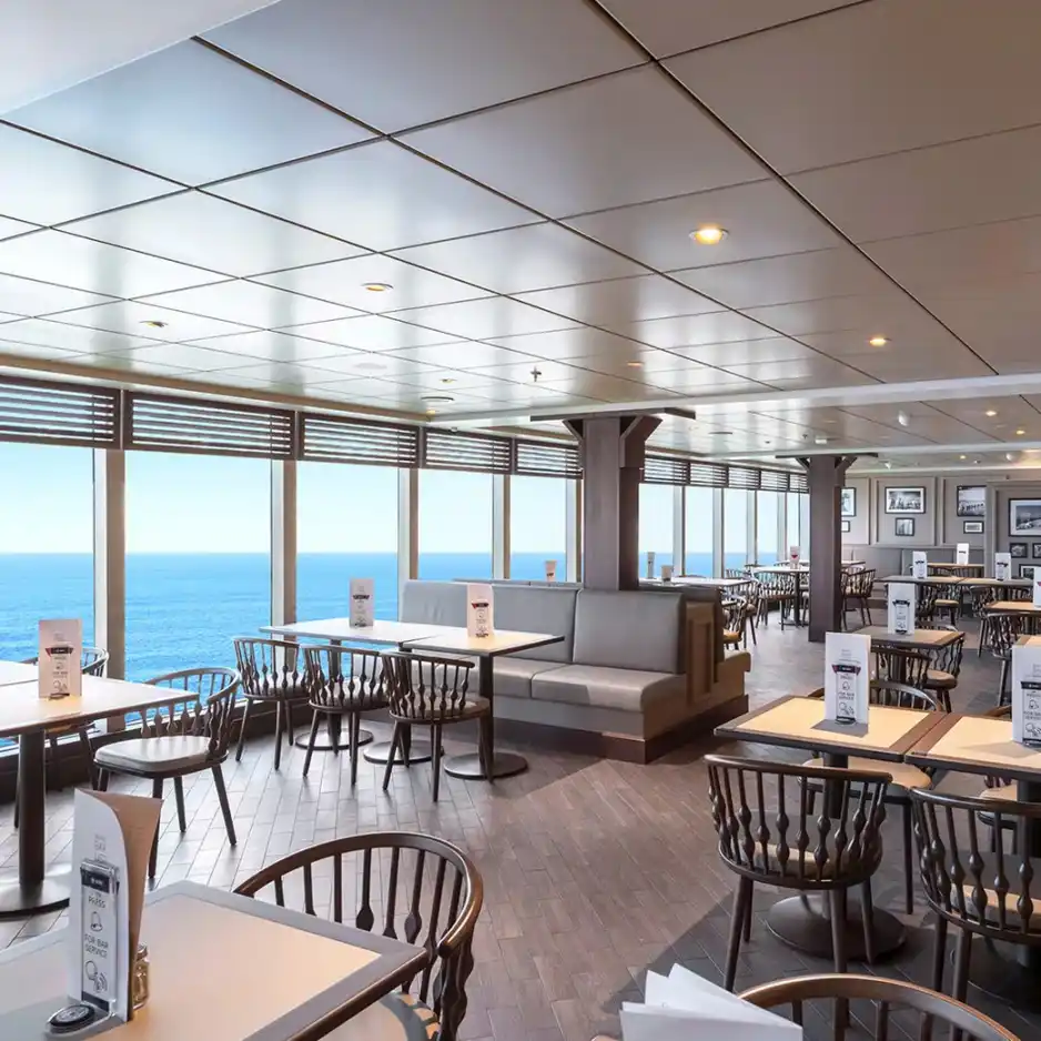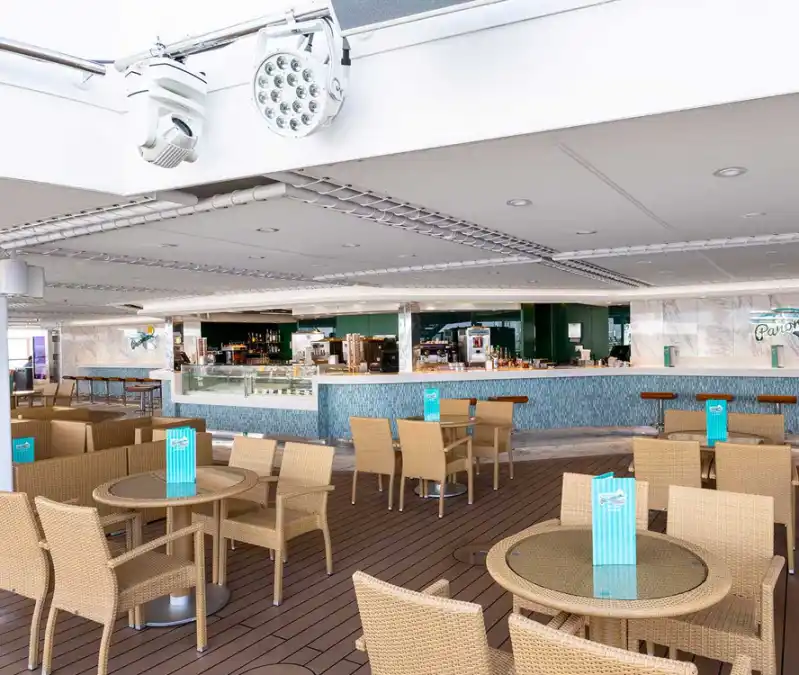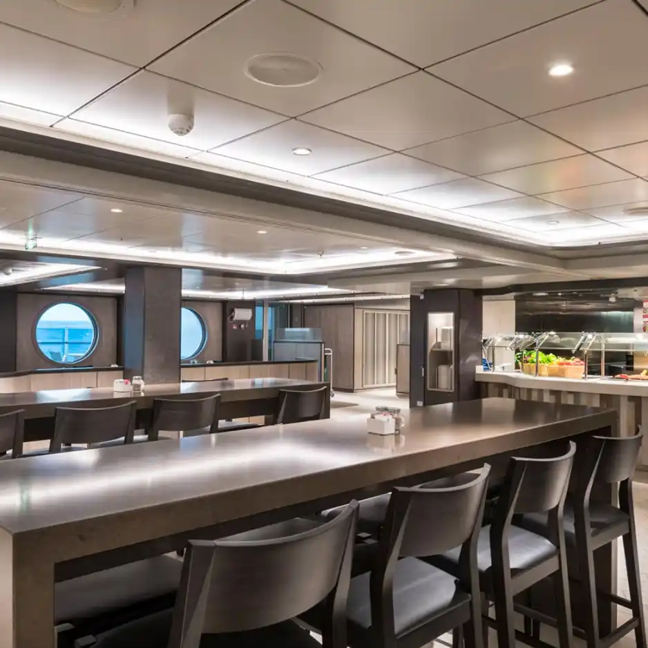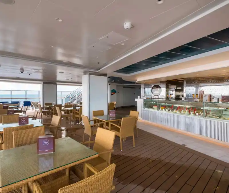 Un lugar maravillosamente cómodo e informal para comer. Es el lugar perfecto para disfrutar de una gran experiencia gastronómica mediterránea informal con una espectacular vista al mar. Las cocinas visibles y una zona de producción de mozzarella permiten a los pasajeros observar cómo nuestros chefs preparan los alimentos frescos. La amplia zona de buffet incluye varios rincones multifunción en los que se sirven platos internacionales, cocina étnica, opciones saludables y multitud de otros sabores.