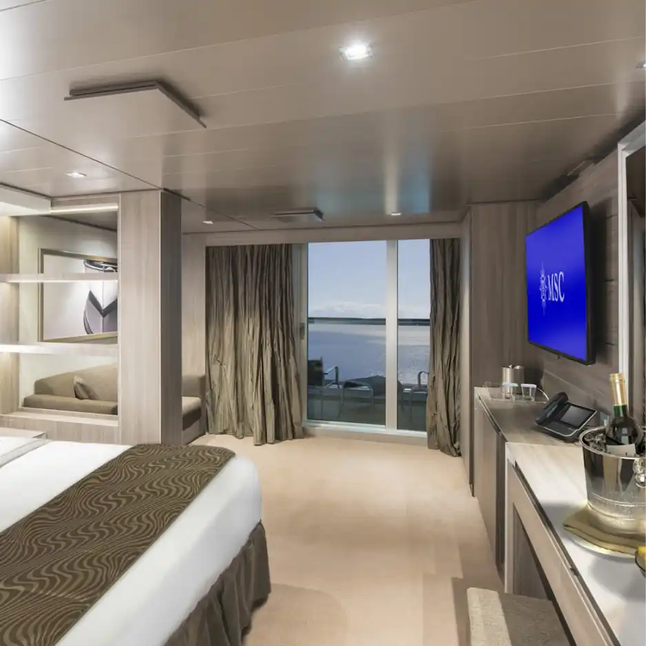 Las suites Aurea en el MSC Seascape ofrecen un nivel elevado de confort y espacio, ideal para quienes buscan algo más que una cabina estándar sin entrar a la categoría de lujo del Yacht Club. Estas suites se ubican en diferentes cubiertas del barco, cuentan con balcón privado en muchas de ellas, y disponen de prestaciones de calidad como cama doble convertible en camas individuales bajo petición, sofá-cama o zona de descanso, minibar, TV interactiva, caja fuerte, aire acondicionado y baño privado con ducha (y en algunos casos bañera).