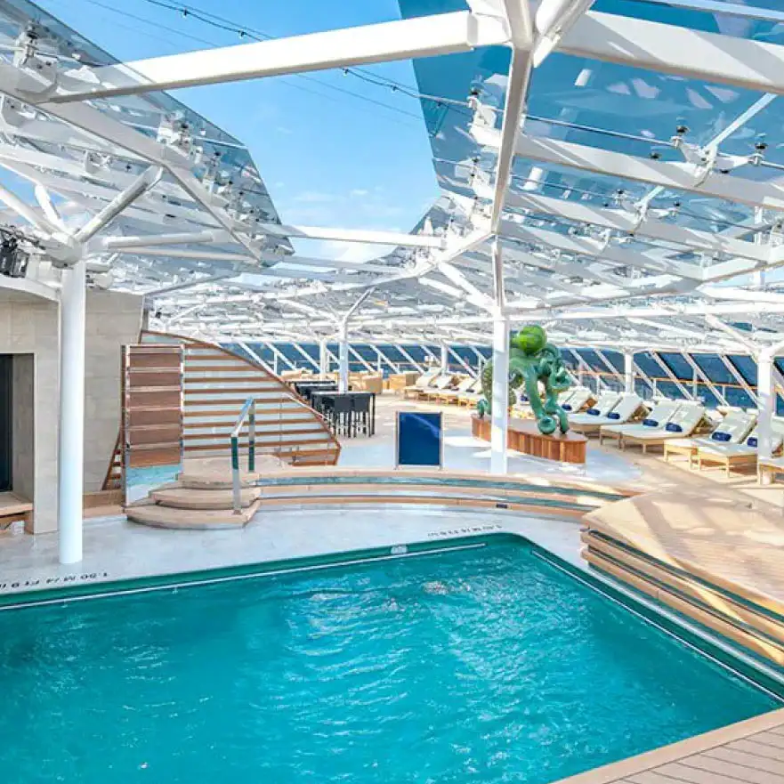 Gracias a su techo retráctil, esta piscina cubierta garantiza la máxima diversión en cualquier época del año. Por la noche, cuando debido a las condiciones meteorológicas no puede utilizarse en modo exterior, se convierte en un lugar para celebrar fiestas, con toda una serie de divertidos eventos temáticos que abarcan desde los 70 hasta El Gran Gatsby.