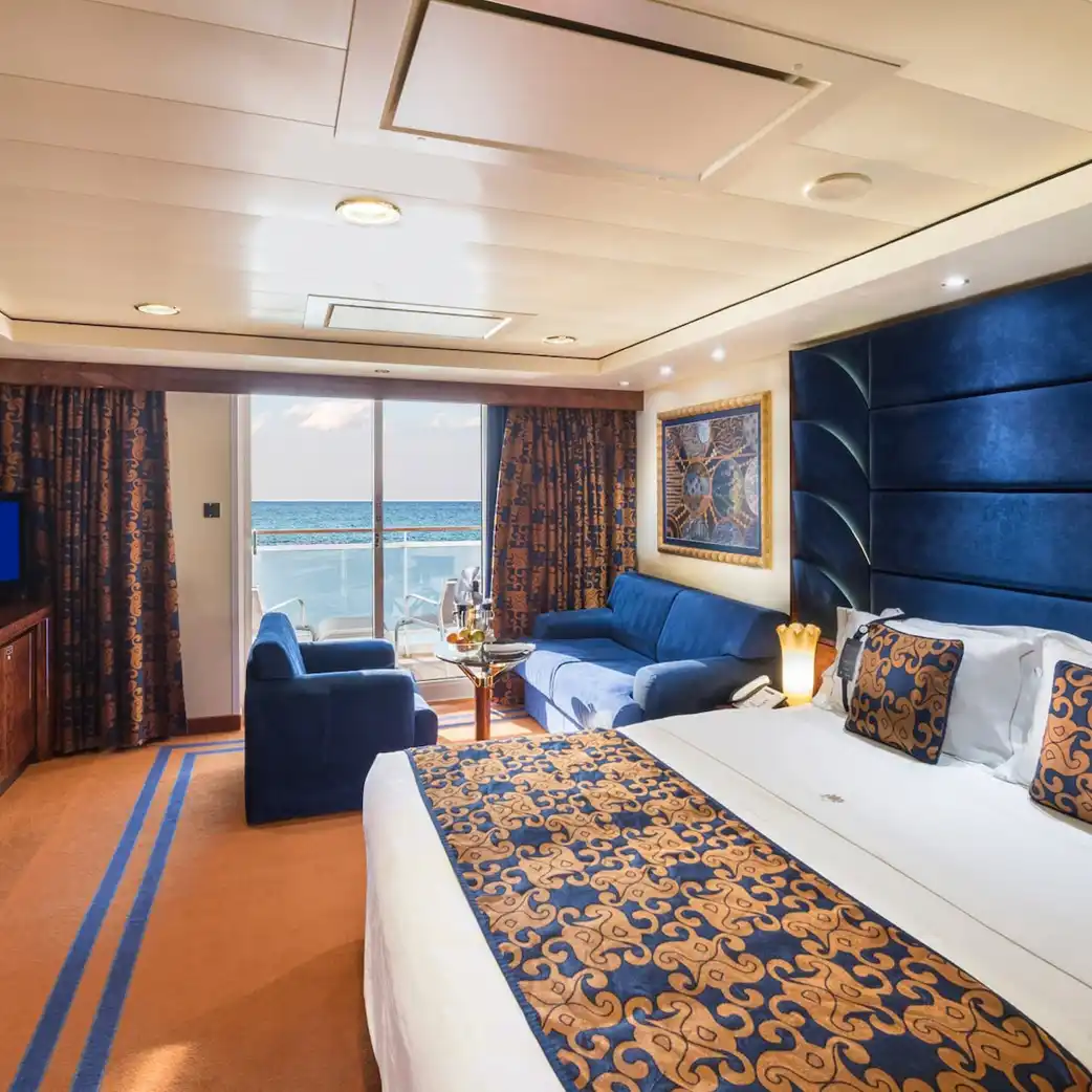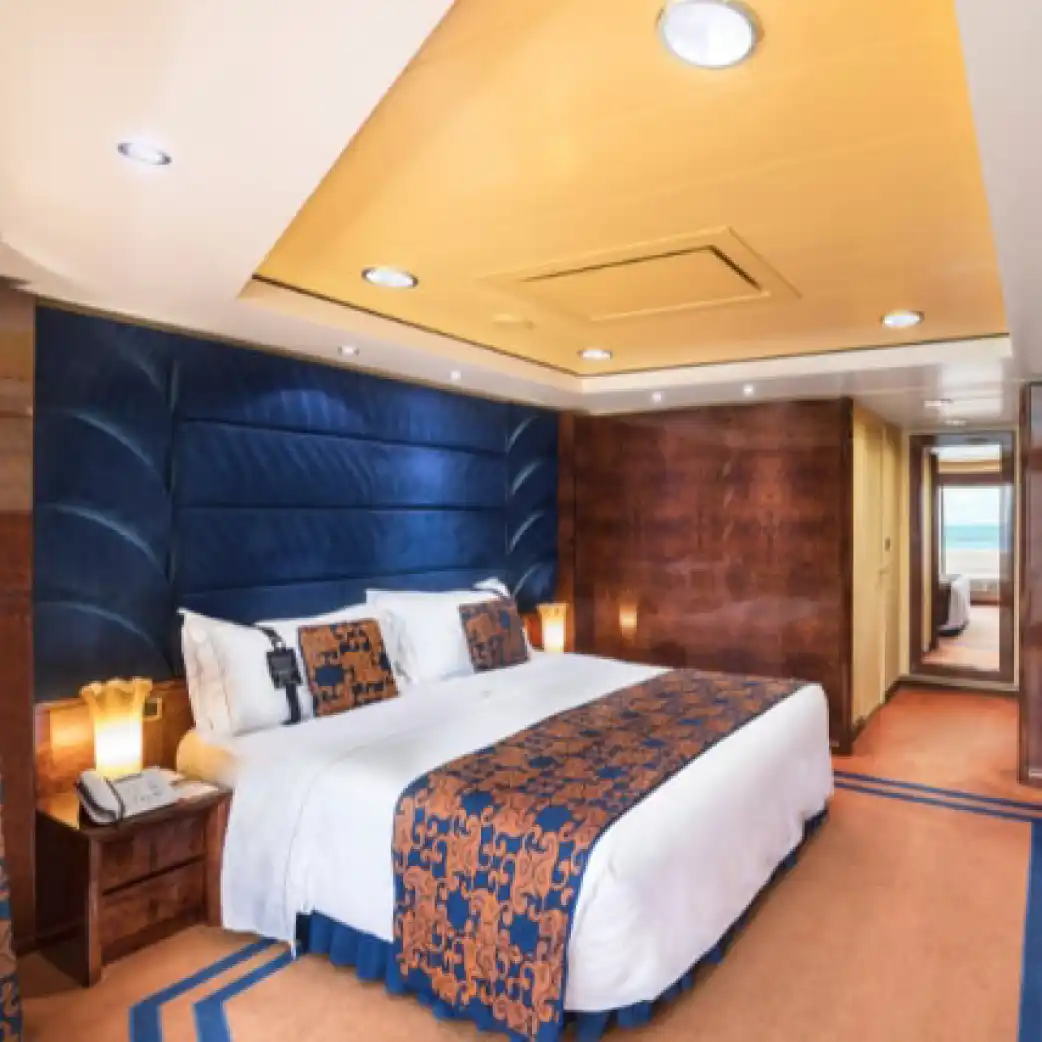 Los pasajeros pueden elegir entre una amplia variedad de camarotes, incluyendo opciones familiares y suites, así como camarotes con balcón y vista al mar.