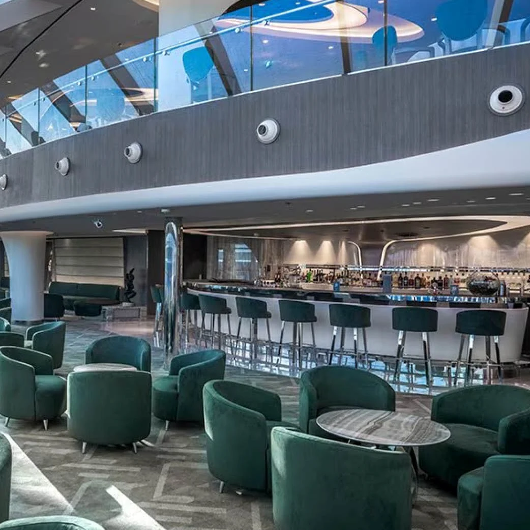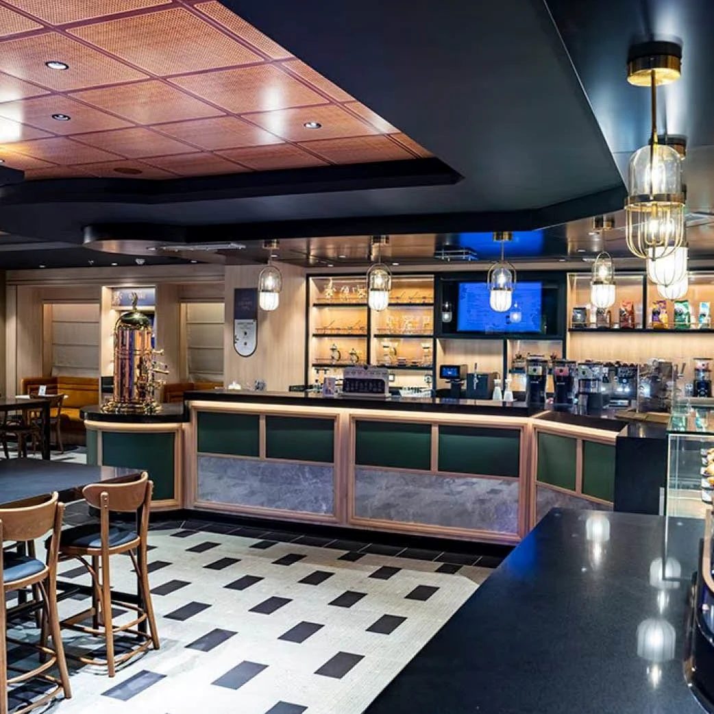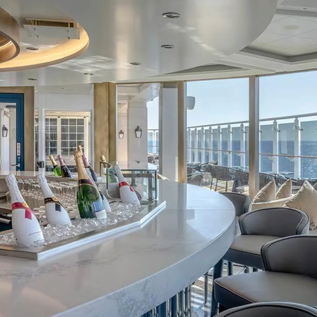 ¡Este bar lo tiene todo!Un elegante salón con impresionantes vistas a popa, un lugar de entretenimiento con escenario y bebidas que aún peuden robarse el protagonismo. Deleita tu paladar con una selección de refrescantes cócteles, vino, cerveza, sidra y más, junto con opciones sin alcohol, incluyendo café y té.