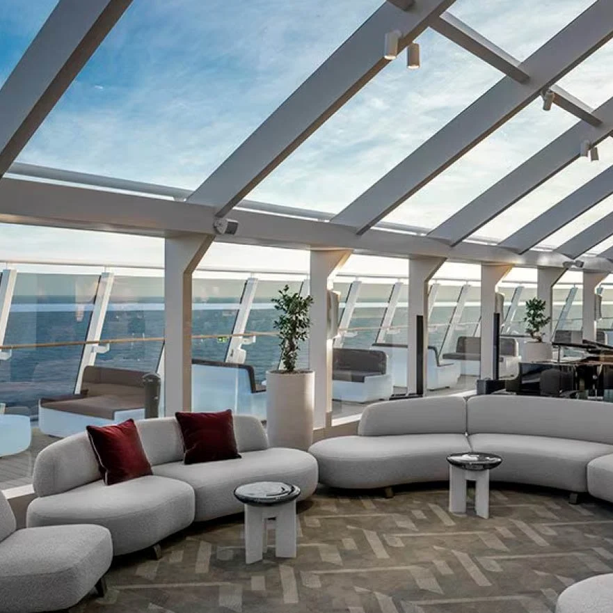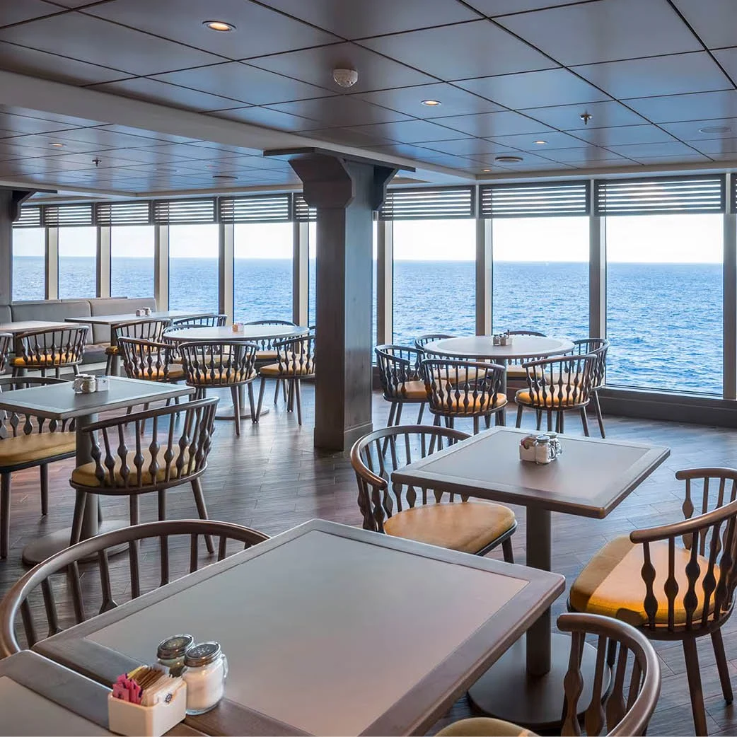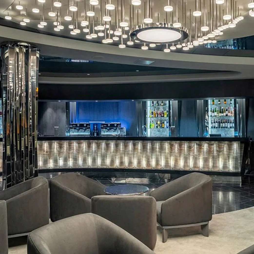 ¡Este bar lo tiene todo!Un elegante salón con impresionantes vistas a popa, un lugar de entretenimiento con escenario y bebidas que aún peuden robarse el protagonismo. Deleita tu paladar con una selección de refrescantes cócteles, vino, cerveza, sidra y más, junto con opciones sin alcohol, incluyendo café y té.