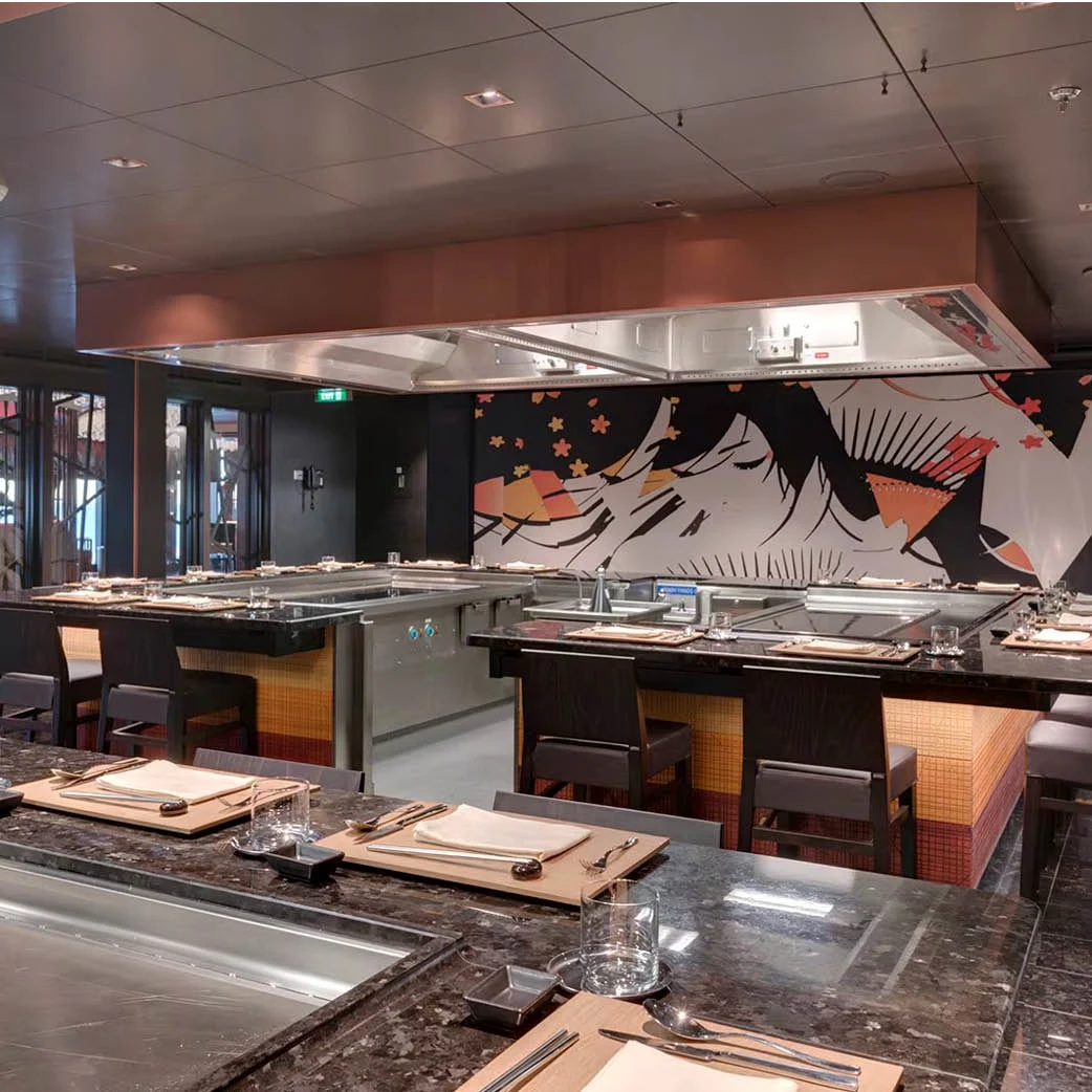 Entra, elige tu lugar en una de las cuatro estaciones de cocina y observa cómo tus deliciosos platos japoneses cobran vida, justo ante tus ojos. Nuestros expertos chefs cocinan con estilo en una parrilla abierta: un festín para los sentidos que ve llamas y los mejores ingredientes chispeantes unirse para formar deliciosos platos que recordarás para siempre.