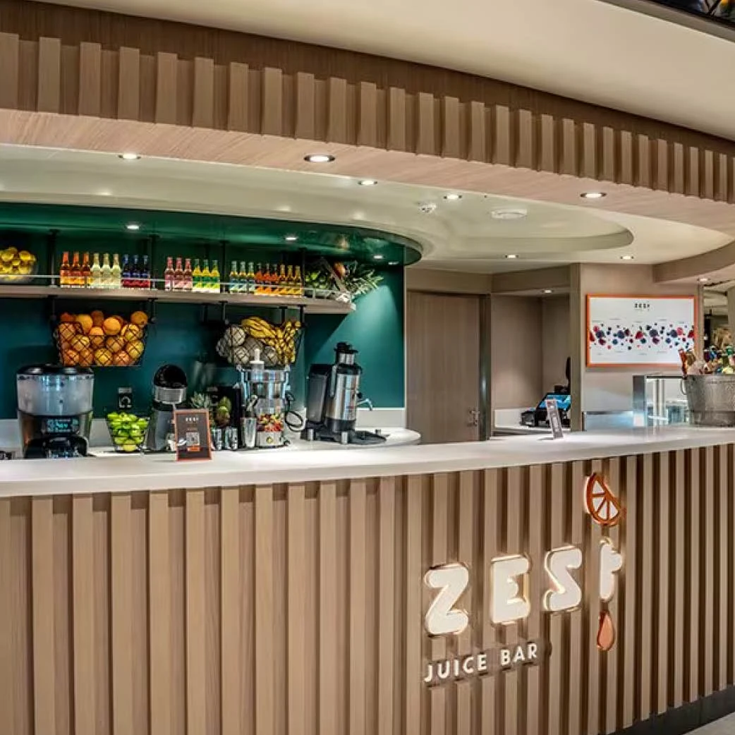 La lista continúa: los huéspedes pueden descubrir el elegante Fizz - Champagne Bar, un animado bar de zumos con los ingredientes más frescos, una heladería con una multitud de sabores para tentar a los golosos.