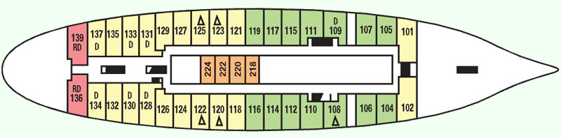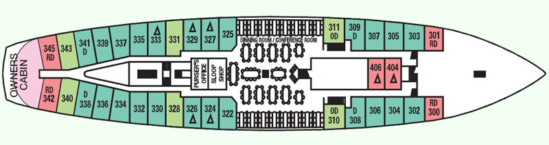 Δ=Tercera cama  D= Cama doble juntando 2 individuales   O=Abre directamente al Restaurante Principal   R=Elevado 4' del suelo (pequeña escalera para la cama)