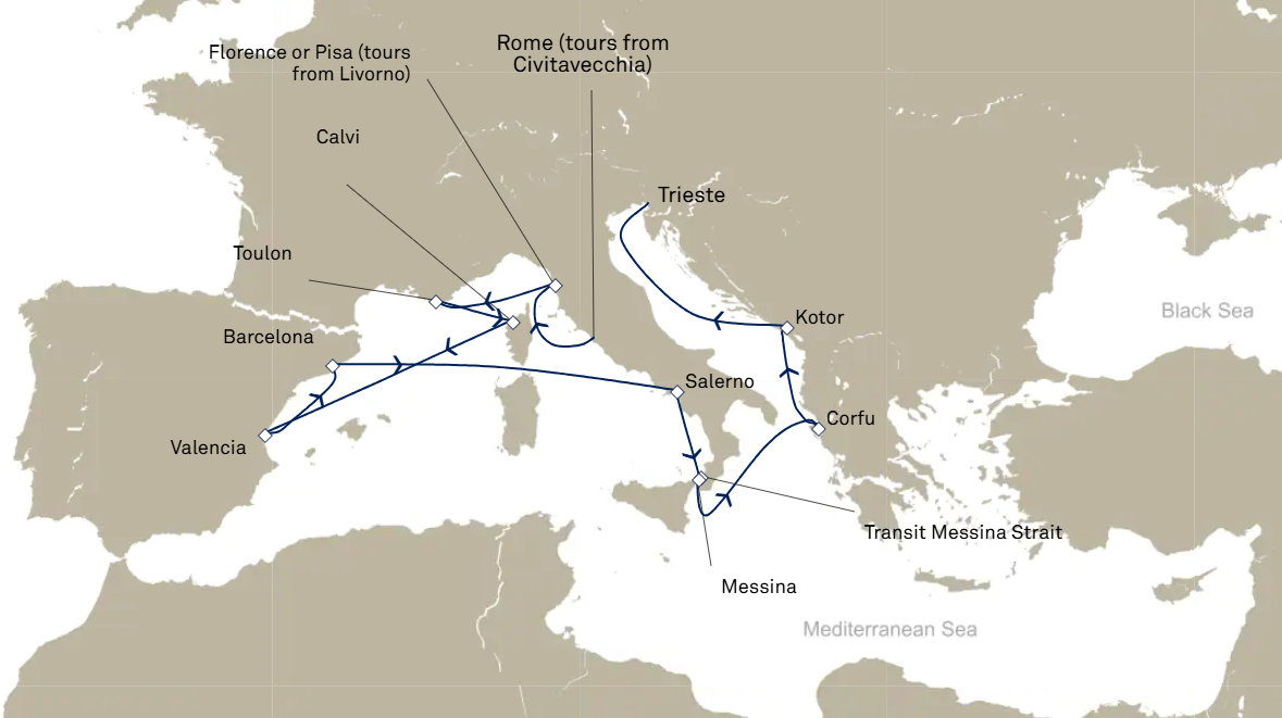 12 ports from Civitavecchia (Rome) to Trieste