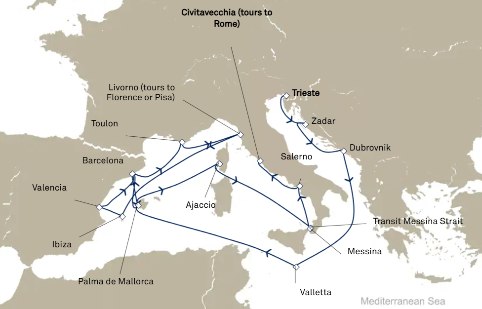 18 ports from Trieste to Civitavecchia (Rome)
