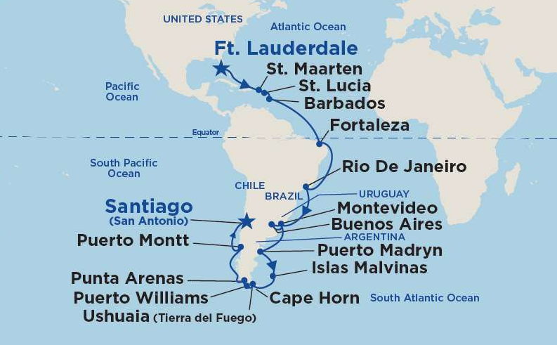 15 ports from Fort Lauderdale (Miami) to San Antonio (Santiago de Chile)