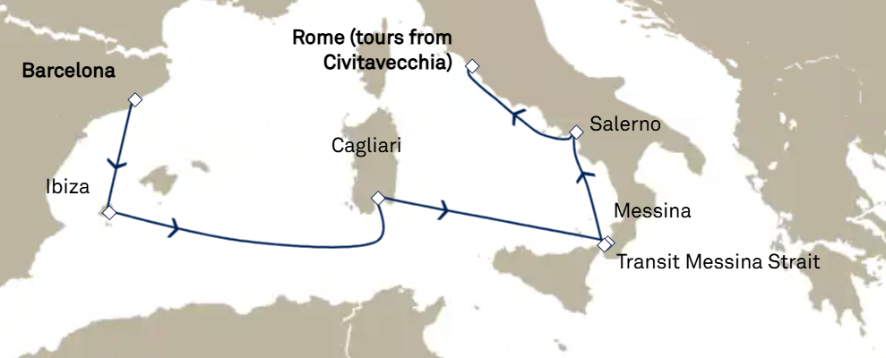 8 ports from Barcelona to Civitavecchia (Rome)