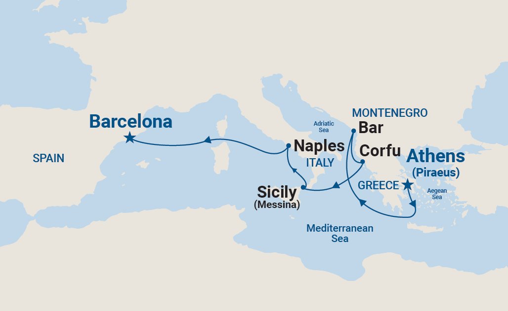 6 ports from Pireo (Athens) to Barcelona