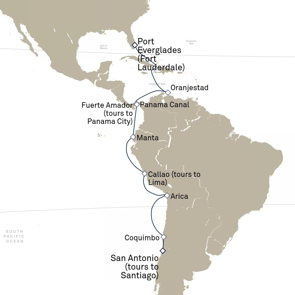 9 ports from San Antonio (Santiago de Chile) to Fort Lauderdale (Miami)
