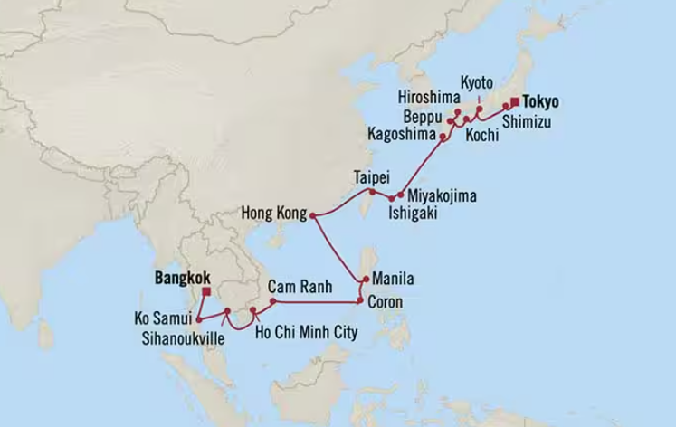 18 ports from Laem Chabang (Bangkog) to Yokohama (Tokyo)