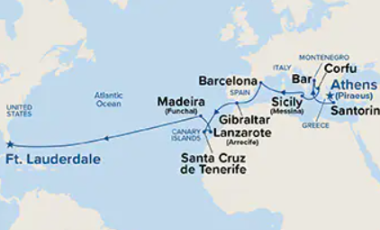 11 ports from Pireo (Athens) to Fort Lauderdale (Miami)